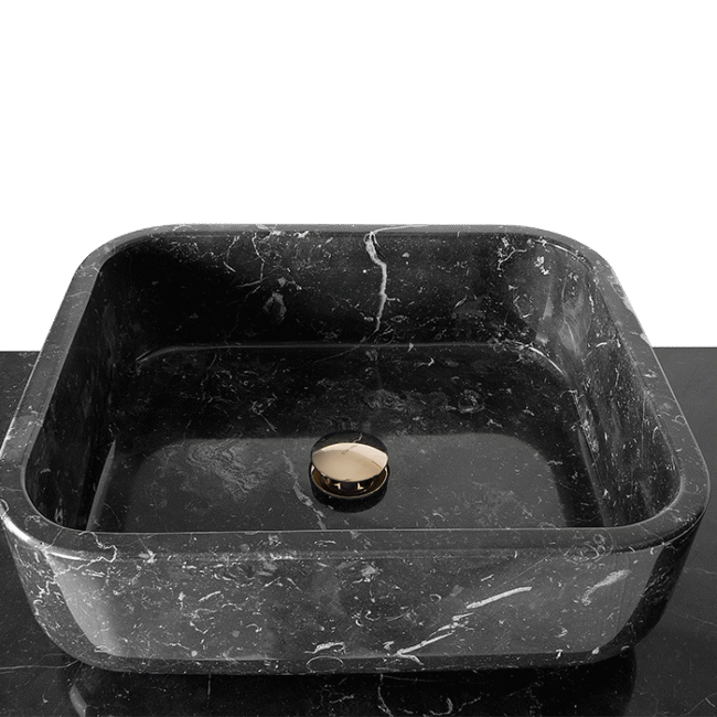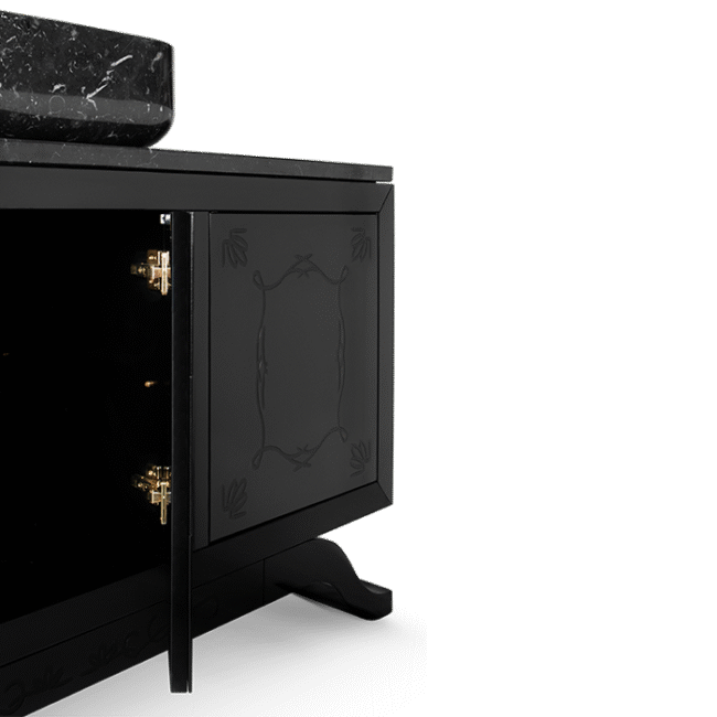 The Symphony Freestanding draws inspiration from church organ tubes, as well as the curves of a violin. Like all of Maison Valentina’s designs, the Symphony Freestanding is handmade by experienced craftsmen, each with different specialties, from metal-work to wood carving. It features a cluster of polished brass tubes that envelopes an exotic wood structure. Its vessel sink is all made of Nero Marquina Marble with a cogwheel-shaped design.