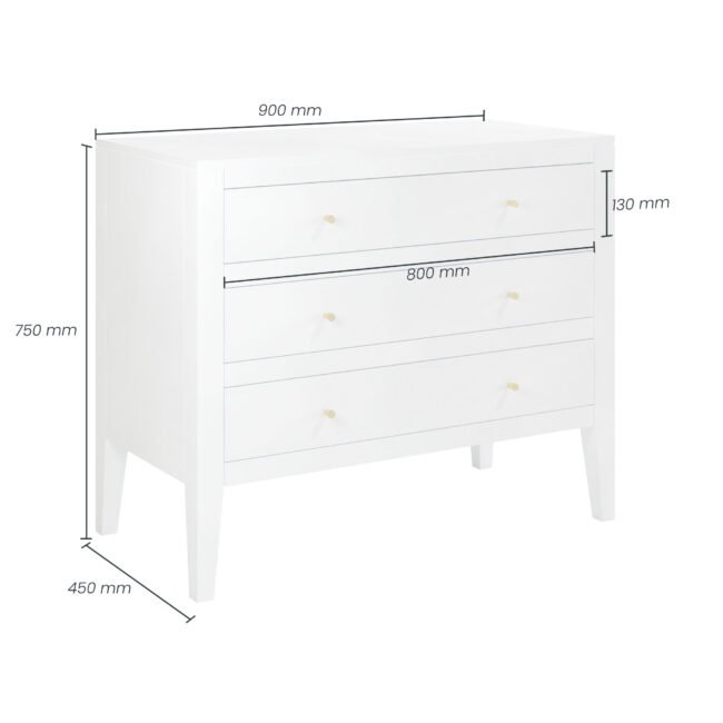 Alton Chest of Drawers White of drawers in birch wood and mdf, tapered legs, cut lines, wooden runners on drawers and brass style handles (require attaching)
