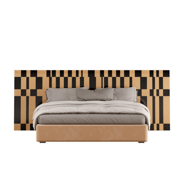 Huesca Bed by Hommés Studio is a retro-modern masterpiece that enhances eclectic bedroom design style. Its marquetry headboard features a captivating square and stripes pattern in elegant neutral tones inspired by mid-century and retro aesthetics. This bed combines vintage charm with contemporary style, ideal for modern interiors, offering a luxurious retreat and a statement piece for discerning homeowners. Elevate your bedroom with the Huesca Bed, where craftsmanship meets creativity to redefine modern bedroom space with timeless elegance and impeccable design.