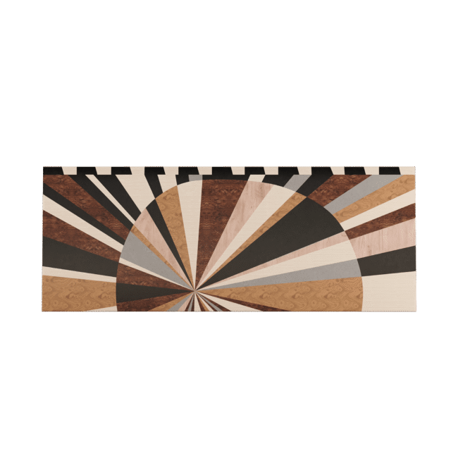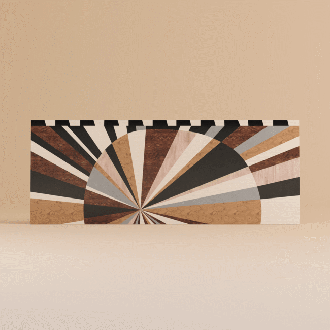 Picaddilly Bed is a masterpiece of craftsmanship and art-deco-inspired pattern design, embodying luxury and sophistication. The modern bed is meticulously made with marquetry techniques and a selection of fine woods arranged in a stunning radial pattern. The Picaddilly bed features stunning marquetry work, showcasing the intricate skill of our artisans. Each piece of wood is carefully selected and inlaid to create a hypnotic radial pattern with rich textures and a selection of wood.