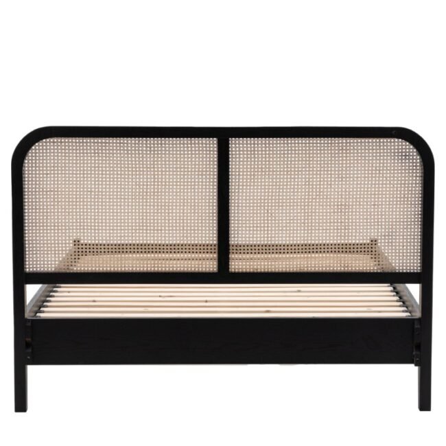 Dramatic statement style sure to become a modern classic. The solid black stand oak frame combines comfort and style ease, with curved corner headboard featuring a woven rattan panel creating a stunning stand out contrast of colours and materials. Available in 4’6″ and 5″ sizes.