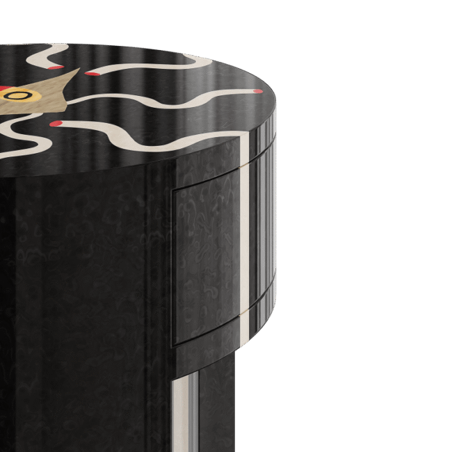 Birds Bedside Table is hand-crafted and boldly decorated using marquetry. Featuring one drawers, its round silhouette with contrasting colors enhances any modern bedroom design. A captivating and modern bedside table, exquisitely designed with a delicate and joyful marquetry pattern inspired by the Dadaism movement, featuring geometric shapes and abstracted objects. The marquetry wood bedside table is made by skilled artisans using natural materials and preserving traditional techniques. Birds Bedside Table is part of an artistic Marquetry products line for interior design, a collection to revive artsy aesthetics and some of the most famous artists’ movements. Birds Bedside Table