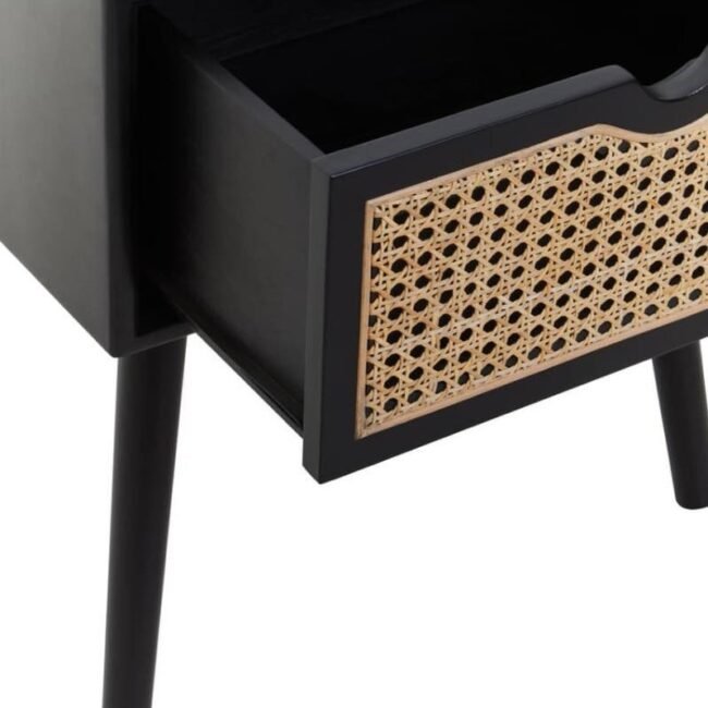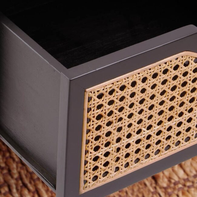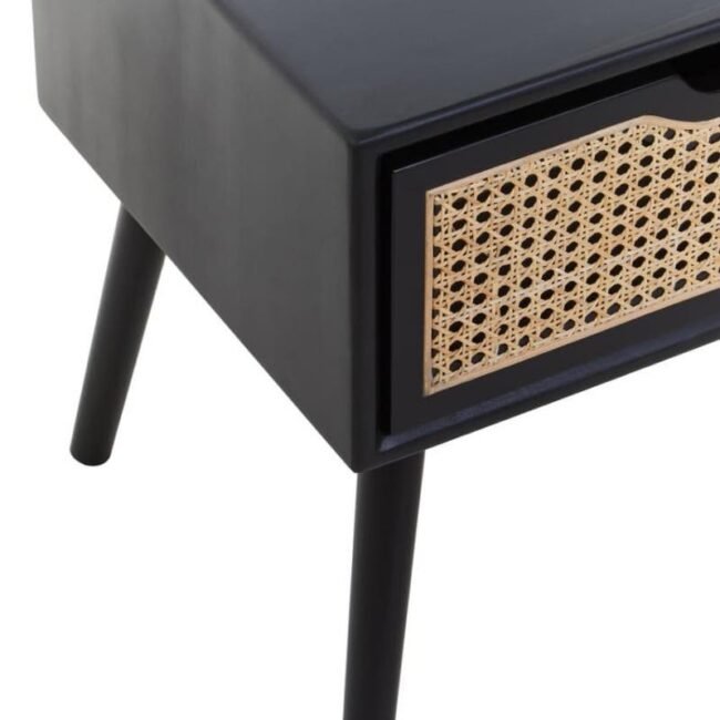 Made from sustainably sourced elm wood, this side table has one storage drawer with an outer inset in rattan weave. The wooden frame in the black finish has angular legs which create a timeless aesthetic.