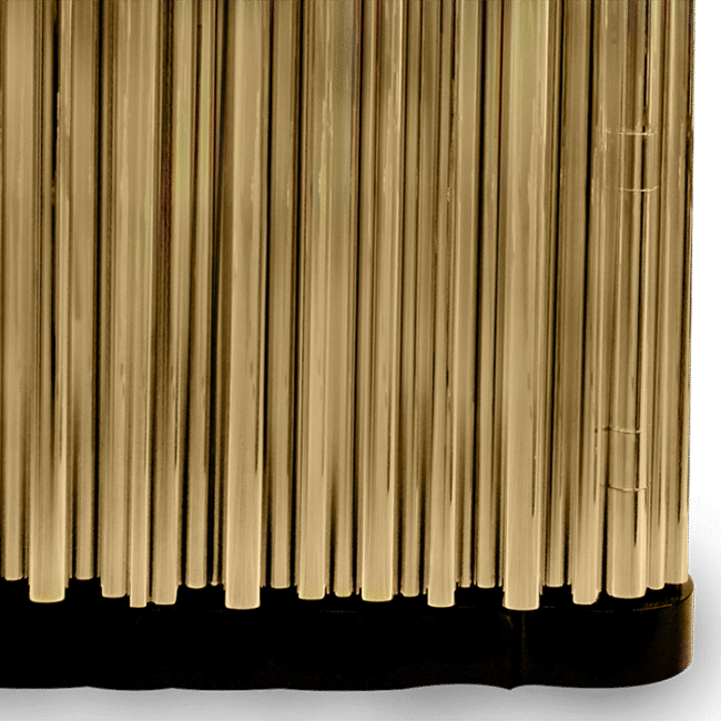 Made from wood finished covered by a tubular structure in gold plated brass. Interior contains one shelv and a drawer.
