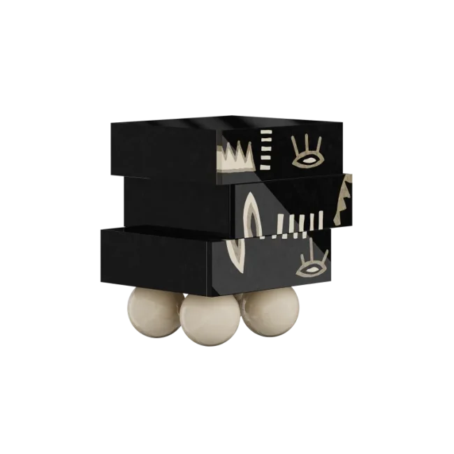 Tribal Bedside Table brings an unmistakable design style. This modern black bedside is a bold furniture piece that will boost the look of any contemporary bedroom decor. Its dynamic silhouette features three drawers resting on four legs of wooden spheres. This bedside table reflects enigmatic symbols and compositions influenced by 20th-century multicultural heritage and pop-culture icons, the expressiveness of our times.