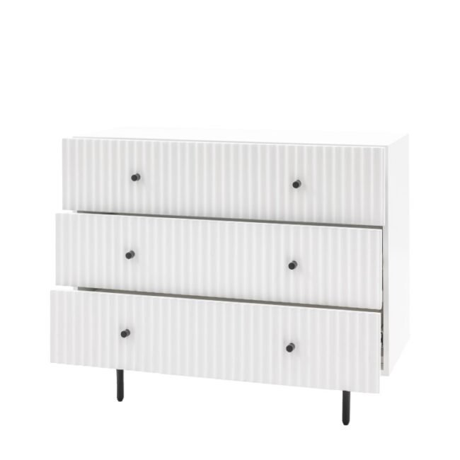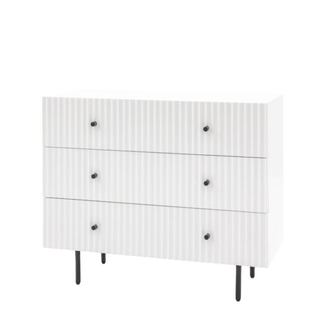 The drawer fronts of this lovely chest of drawers, in a white painted finish, feature a stylish vertical scalloped design, giving a unique upmarket look. Black metal legs and handles complete the look. Perfect for any contemporary apartment interior, the wardrobe would equally at home in a wide range of interiors. Matching pieces available. Also offered in blue and grey.