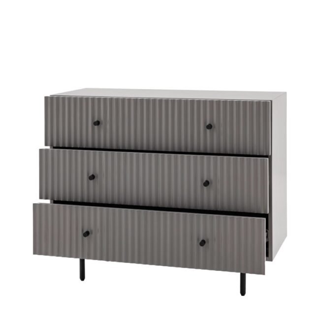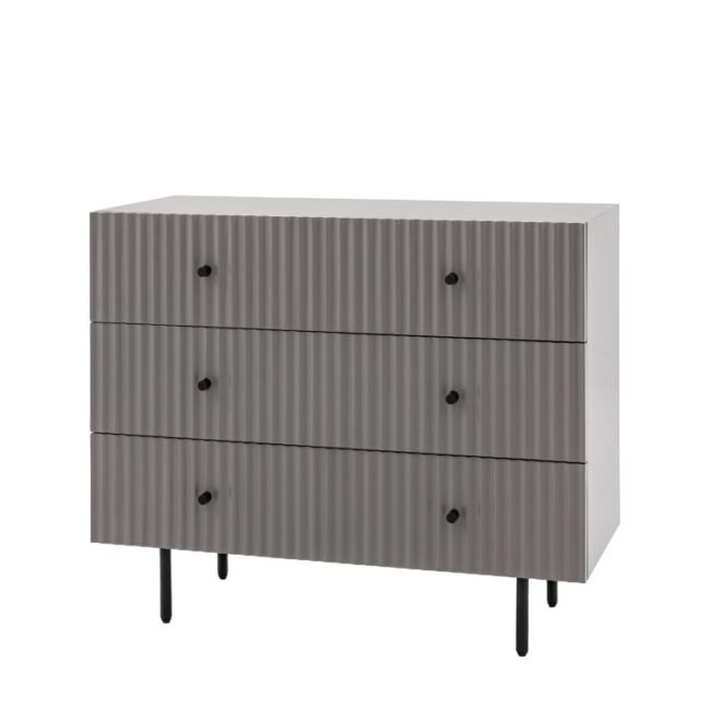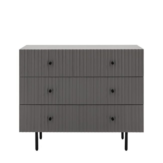 The drawer fronts of this lovely chest of drawers, in a grey painted finish, feature a stylish vertical scalloped design, giving a unique upmarket look. Black metal legs and handles complete the look. Perfect for any contemporary apartment interior, the wardrobe would equally at home in a wide range of interiors. Matching pieces available. Also offered in white and blue.