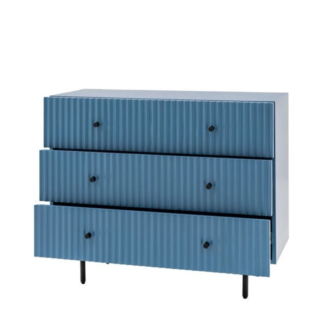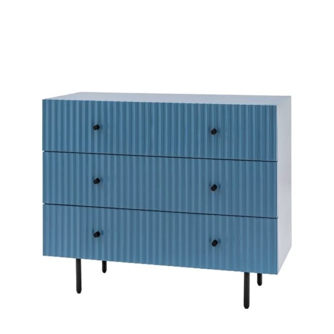 The drawer fronts of this lovely chest of drawers, in a blue painted finish, feature a stylish vertical scalloped design, giving a unique upmarket look. Black metal legs and handles complete the look. Perfect for any contemporary apartment interior, the wardrobe would equally at home in a wide range of interiors. Matching pieces available. Also offered in white and grey.