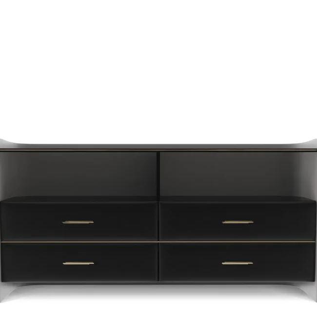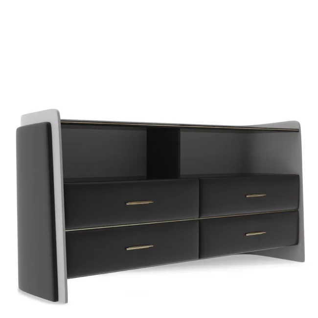 The Charla Dresser revolutionizes bedroom storage with its modern twist on a timeless and classic piece. This dresser has only the finest materials, such as polished brass, black lacquer, black and grey leather, walnut root, and smoked glass. Its design offers a premium yet versatile solution for organizing any bedroom or closet with a modern feel. With its boundless elegance and luxurious design, the Charla Dresser combines style and functionality, bringing sophistication to any interior decor.