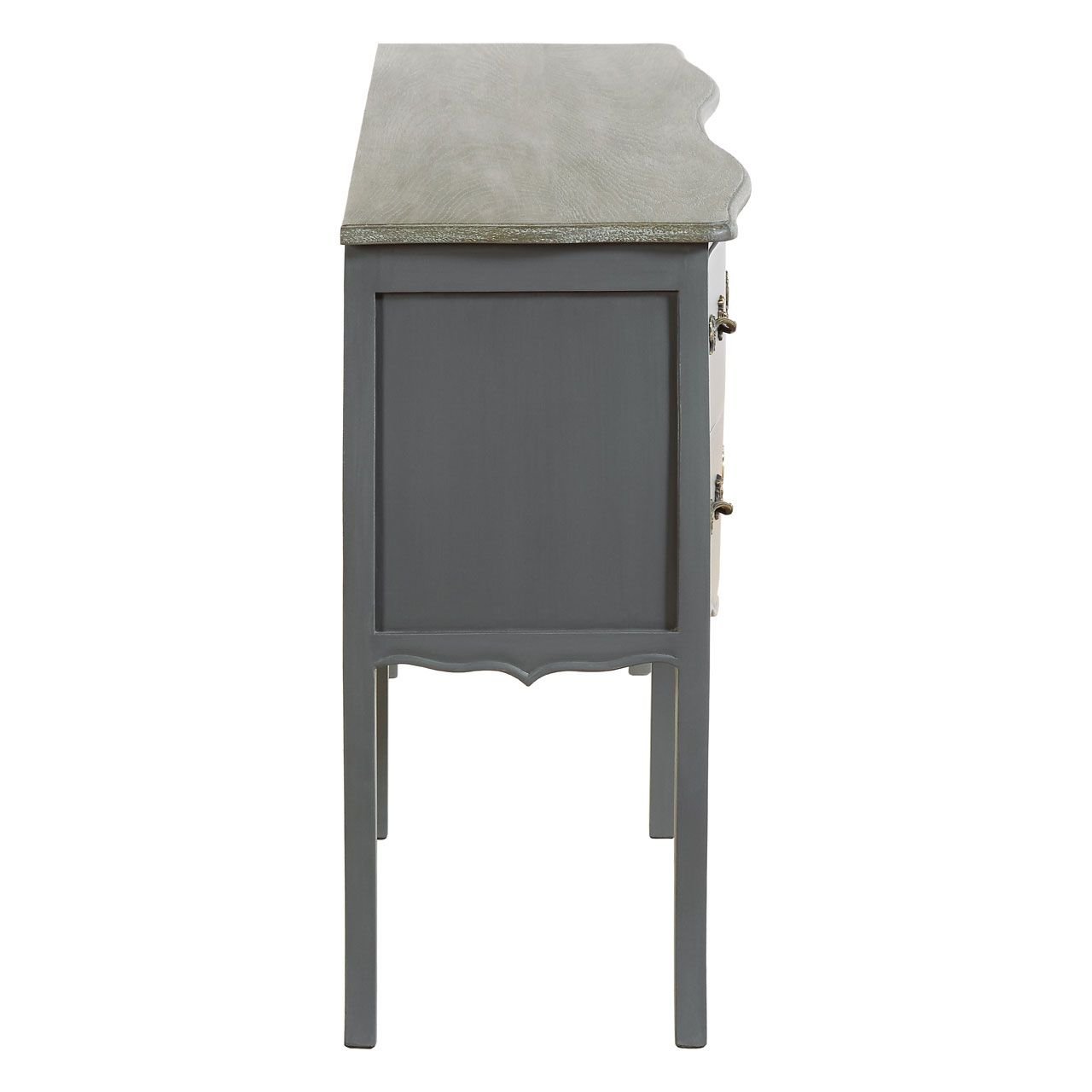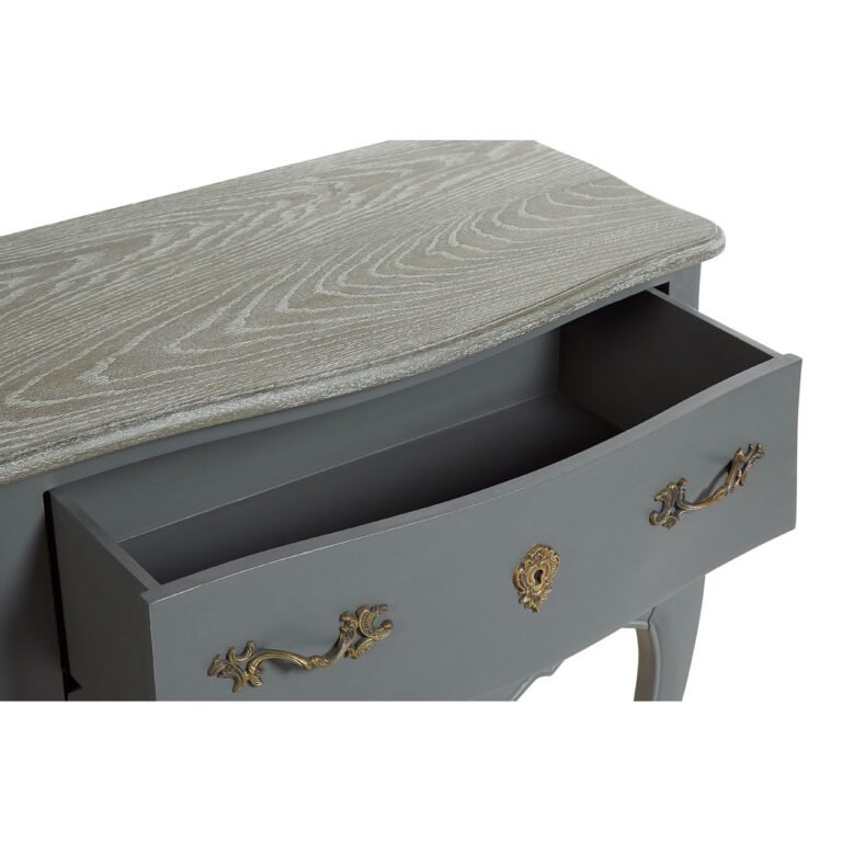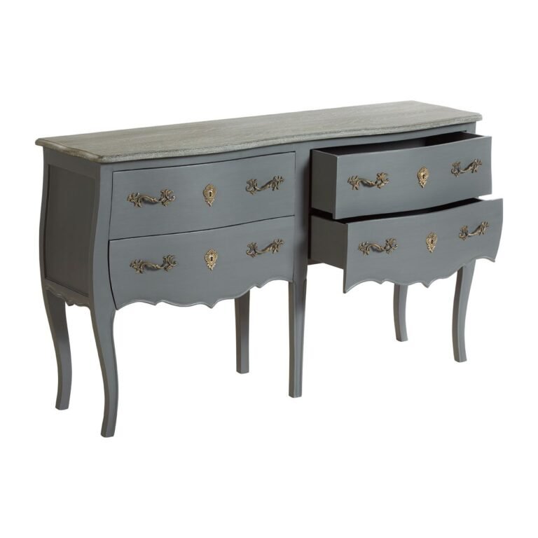 Huxley 4 Drawer Double Chest: The cabinet of this French-inspired chest is made from natural bayur wood, and has a muted grey finish that contrasts with the richly grained top section. Four drawers with ornate baroque handles are integrated into the cabinet. Panelled detailing at the sides and back and carved legs add further to its chic presence.