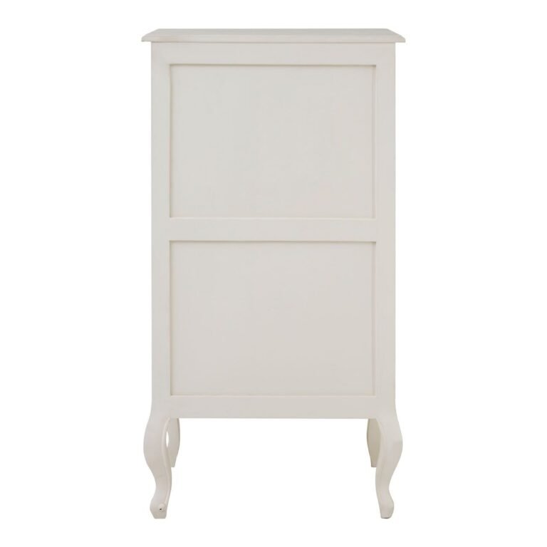 Huxley 5 Drawer White Chest: The Huxley chest features five drawers, each one adorned with a baroque-style handle. These handles complement the chest’s carved detail, from the curving feet to the undulating base. It’s made from natural bayur wood, slightly coarse in texture for a tactile finish. The white colour features distressing to give it an antique look.