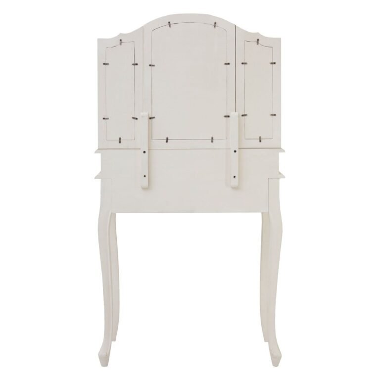 Huxley Dressing Table With Mirror White: The Huxley dressing table is formed from bayur wood and features carved legs and an undulating apron. The wood is coloured a crisp white and features subtle weathering that accentuates its curves. Ornate brass coloured metalwork adorns its storage drawers. Its three panel mirror can be adjusted at the sides.