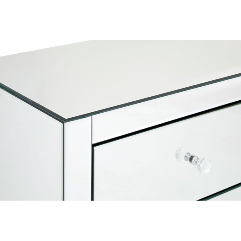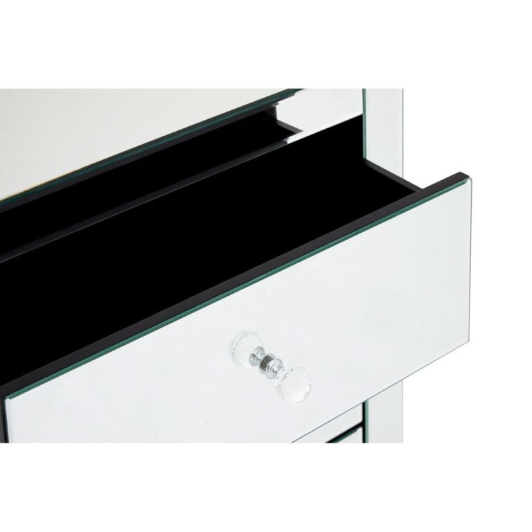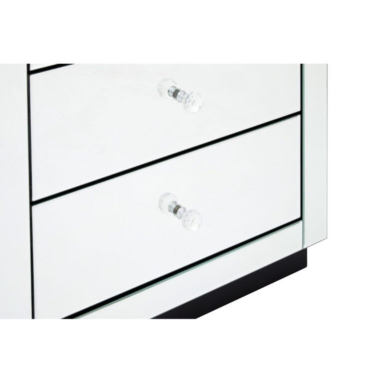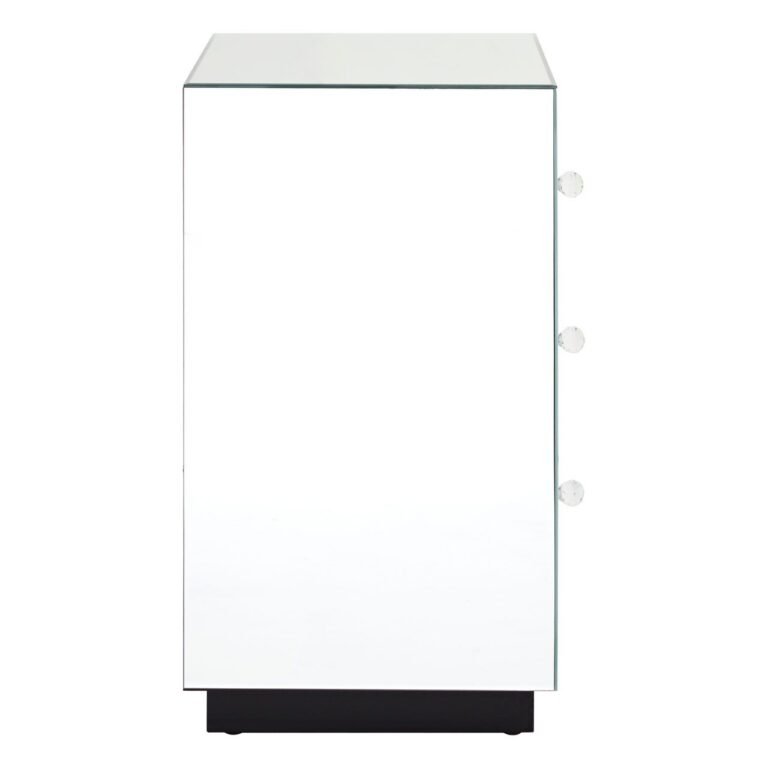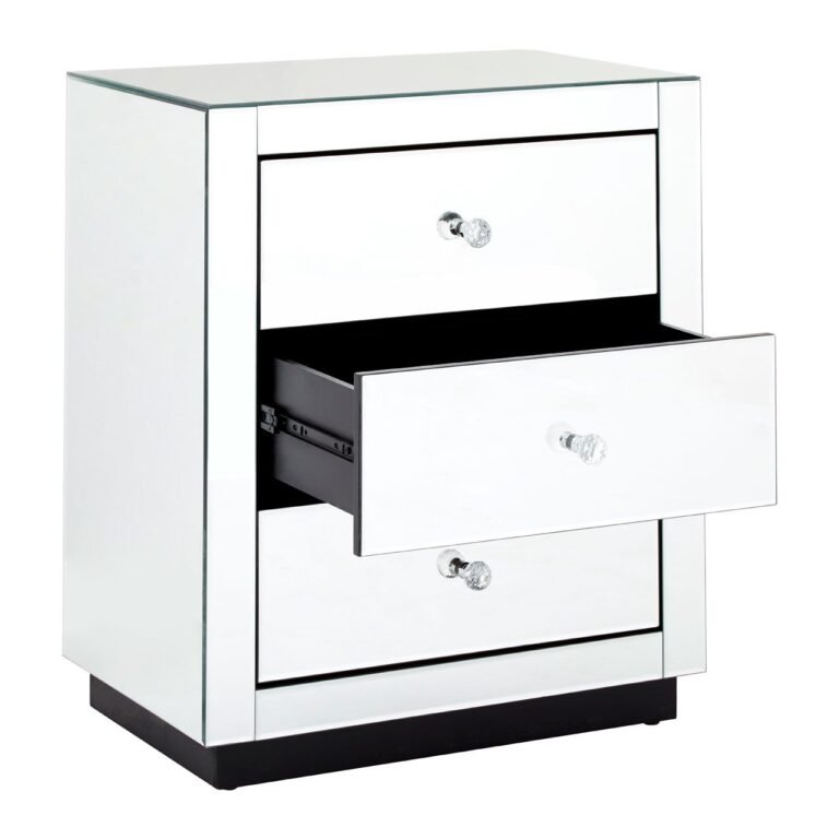 Ltil 3 Drawer Chest: The Ltil bedside table features three rectangular drawers, each with a faceted crystal glass handle to add a touch of elegance. Straight, angular design lines are accentuated by bevelled edges that refract light and add depth. A black base elevates the table from the ground, its dark colour counterpointing the mirrored finish.