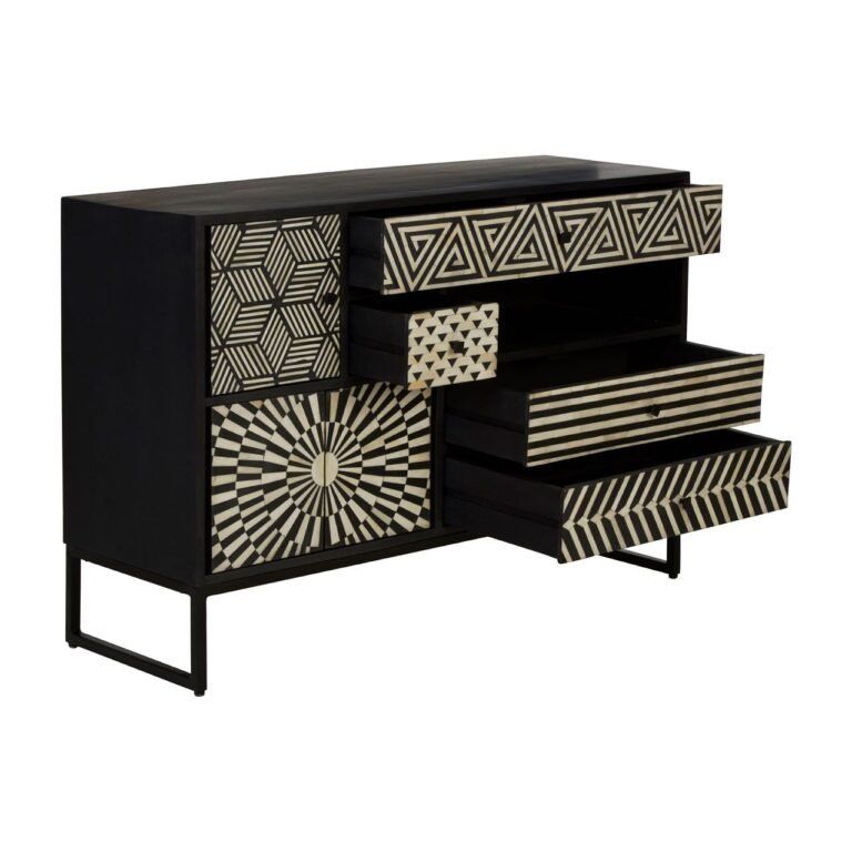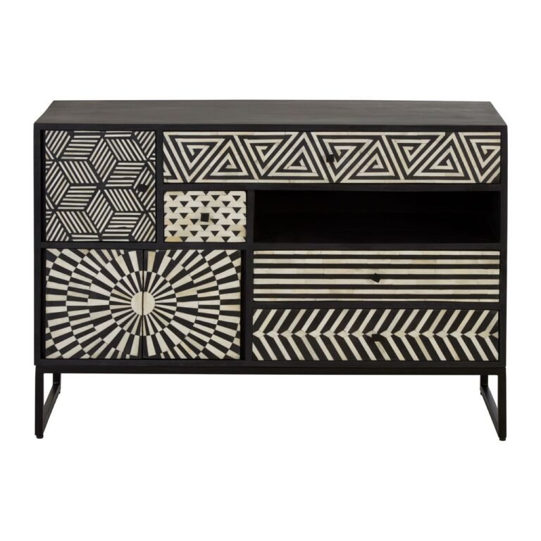 Exquisitely crafted, this Ohom Monochrome Chest is made from a black metal frame and intricate bone inlay and acacia wood detail. Monochromatic geometric patterns face the drawer fronts, which are different sizes to ensure versatile storage.