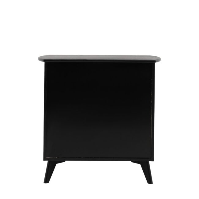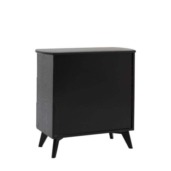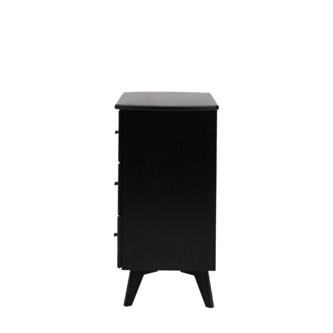 Dramatically stylish this 3 drawer chest combines practicality and statement style. Black stained solid oak & veneers create stunning contrast with the natural rattan woven drawer panels, creating piece of stand out bedroom furniture. With a hint of art deco glamour the simply shaped body and elegantly tapered legs let the contrasting materials speak for themselves.