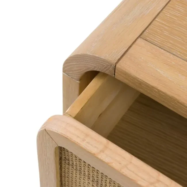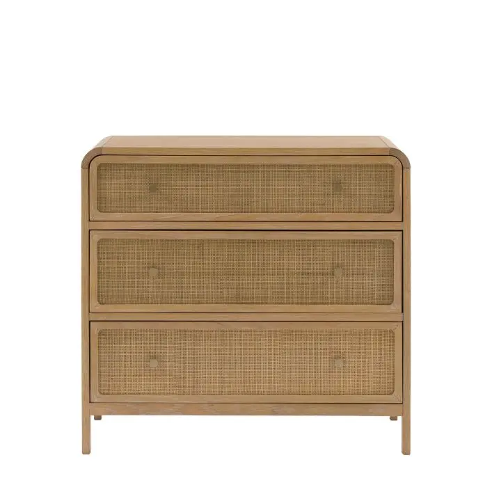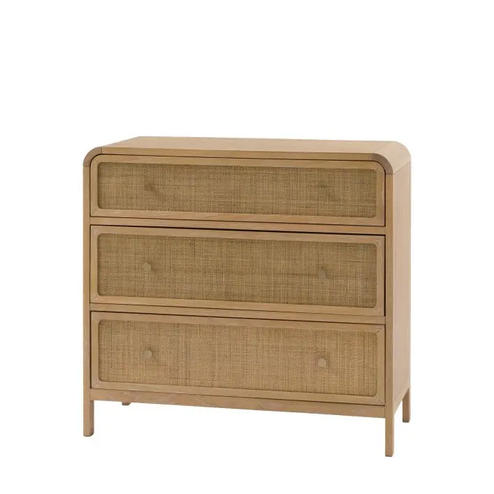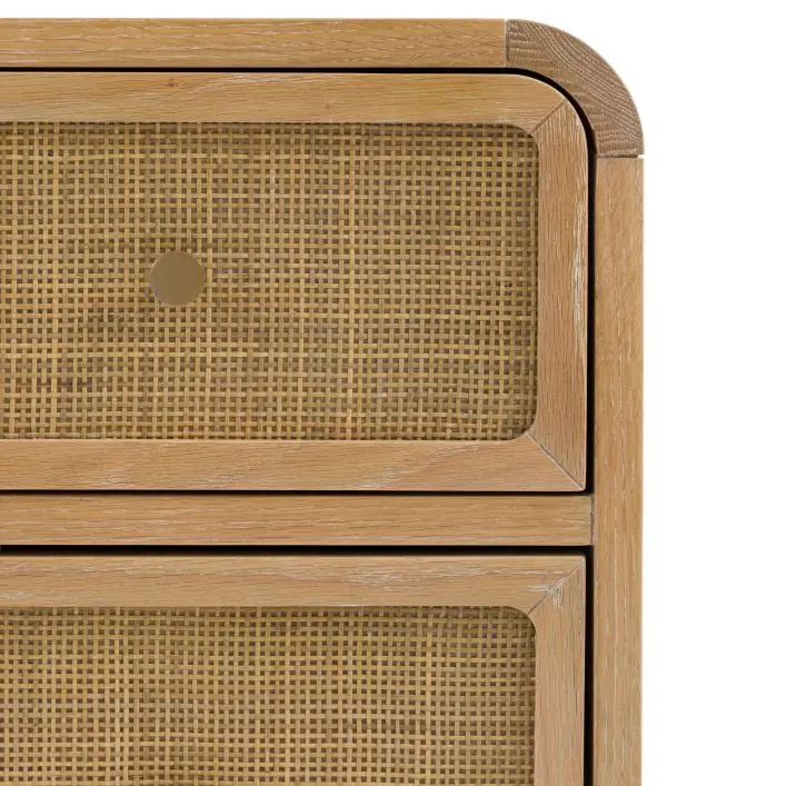 Urbi 3 Drawer Chest: Bring a touch of rustic charm with this beautifully crafted chest; blending oak solids, veneers, and solid rubberwood timbers for durability and warmth. The standout feature being the natural hand-woven rattan, adding texture and an artisanal feel. Finished in a soft lime-washed tone, the collection has a relaxed, lived-in character. Gently curved tops lend a sense of softness, while bronzed metal handles add a subtle vintage touch. Perfect for creating a calming, timeless bedroom space with natural beauty at its heart.