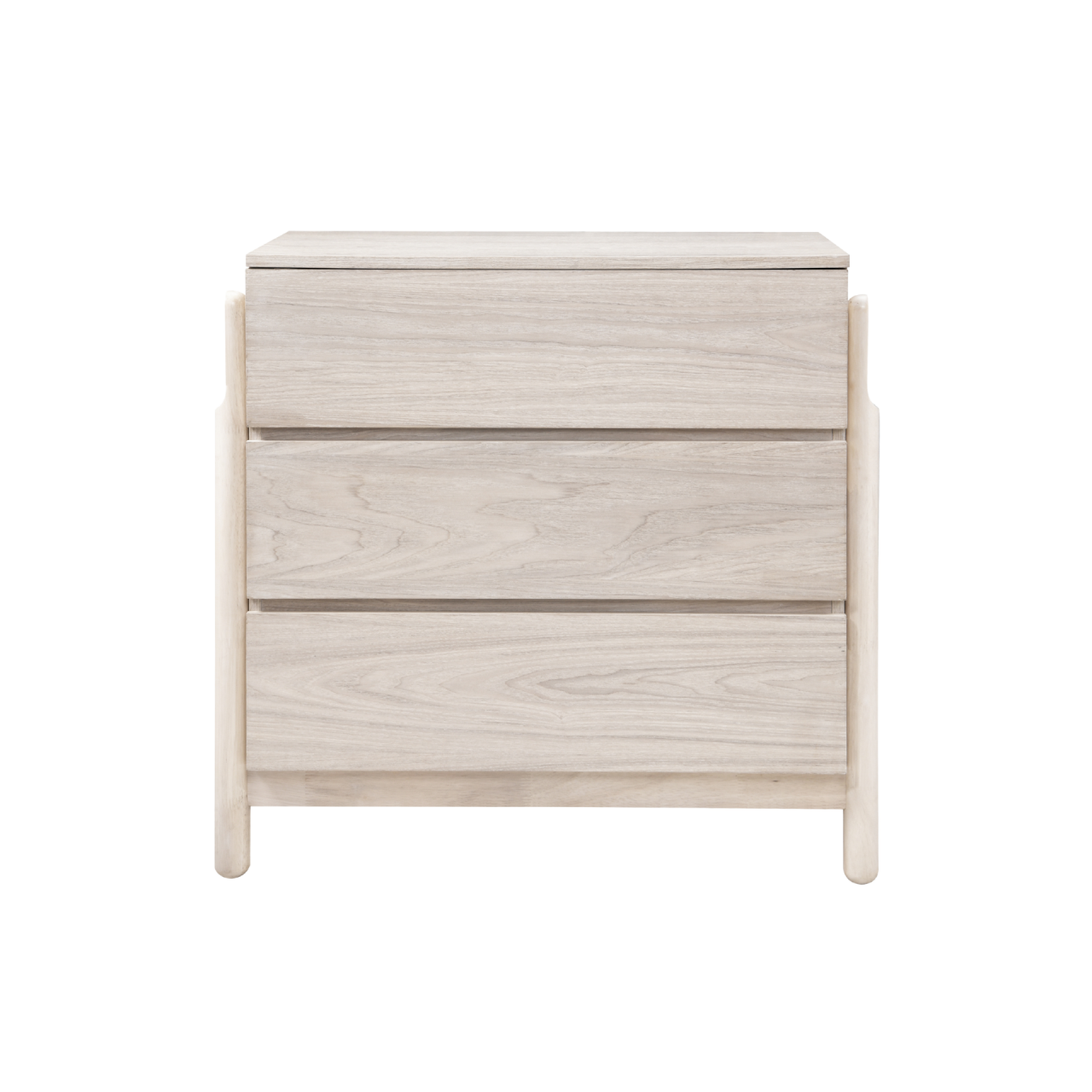 The Whisper 3 Drawer Chest blends functionality and timeless style, making it a perfect addition to any contemporary bedroom. Finished in a classy, white-washed oak colour, this chest offers ample storage with three spacious drawers. Its round wooden legs stand on the outside of the frame, adding elegance and visual interest with their asymmetric shape. Crafted from sustainably sourced materials, this bedside supports eco-friendly living without compromising on style.