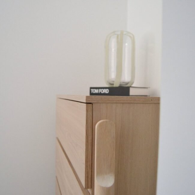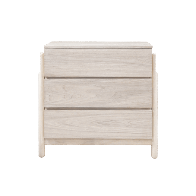 The Whisper 3 Drawer Chest blends functionality and timeless style, making it a perfect addition to any contemporary bedroom. Finished in a classy, white-washed oak colour, this chest offers ample storage with three spacious drawers. Its round wooden legs stand on the outside of the frame, adding elegance and visual interest with their asymmetric shape. Crafted from sustainably sourced materials, this bedside supports eco-friendly living without compromising on style.