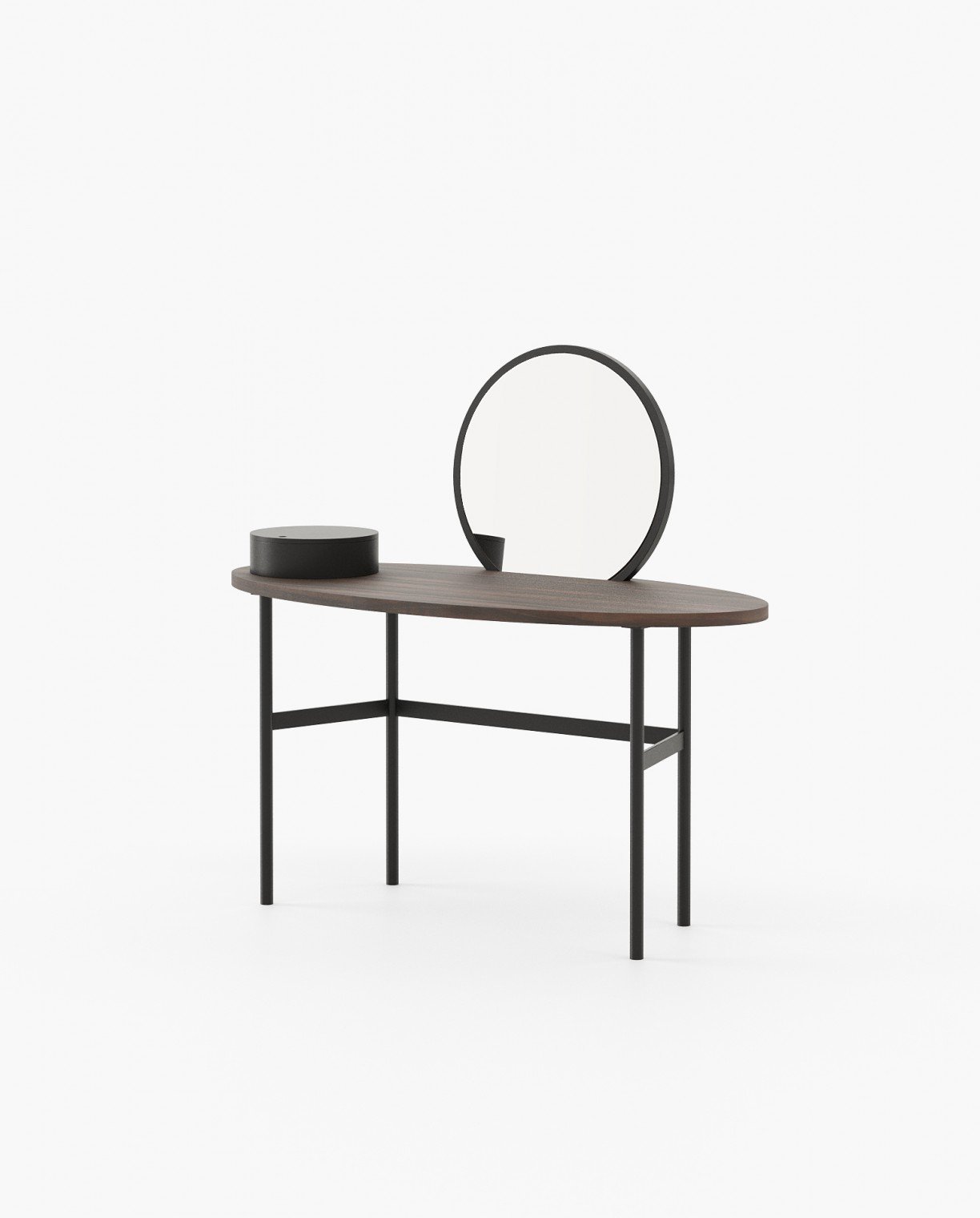 Arcadia Dressing Table embodies a minimalist design with its graceful oval shape and a round mirror. This piece adds a touch of sophistication to any bedroom or dressing area, providing a stylish and functional space for daily routines while complementing the overall decor.