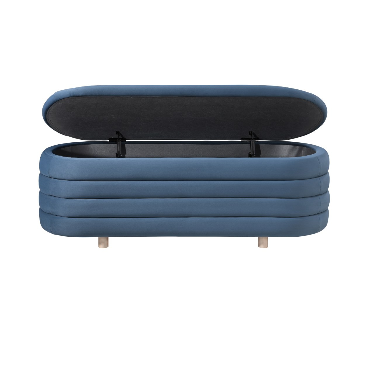 The Ripple Ottoman balances elegance and functionality, offering a stylish storage solution suitable for show homes and spacious residential interiors. Available in dove boucle or blue velvet fabric and features a memorable ribbed design. Four round legs give the piece a bit of extra height. The top lifts with an easy-access mechanism, making it a perfect addition to large bedrooms, hallways, or living rooms. Made using sustainably sourced materials, it is a practical and environmentally conscious choice.