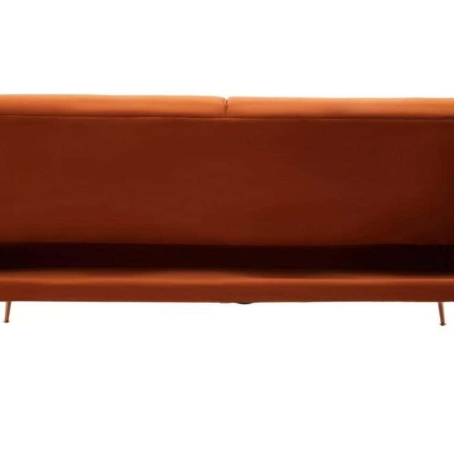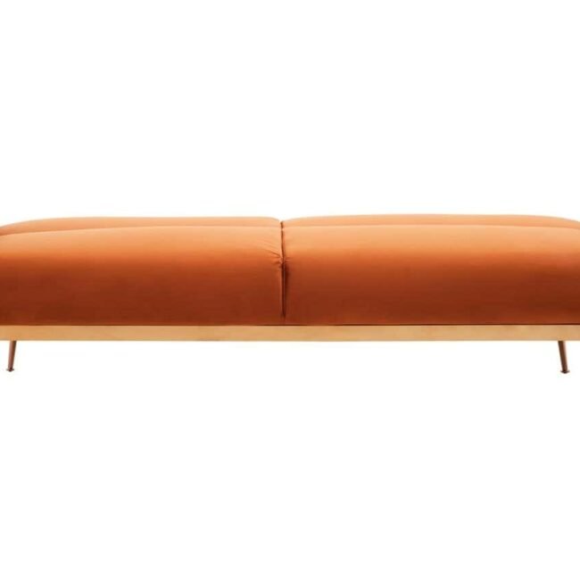 Indulge in unparalleled comfort as you recline on the plush surface of this sofa bed. Enveloped in opulent burnt orange velvet, it features a generously foam-padded seat complemented by angular arms and a supportive backrest. The innovative lowering mechanism effortlessly transitions the backrest into a cozy bed, offering both style and functionality in one seamless design.