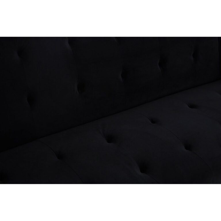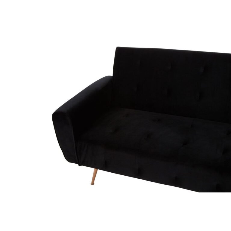 Bramley Black Velvet Sofa Bed: This chic sofa bed is upholstered with sumptuous black velvet. The button tufting that textures its seat and backrest offers a nod to traditional style, but the restrained design lines make a contemporary statement. The backrest lowers to extend the sofa into a comfortable place to repose. Its minimal legs have a warm gold finish to complement the black.