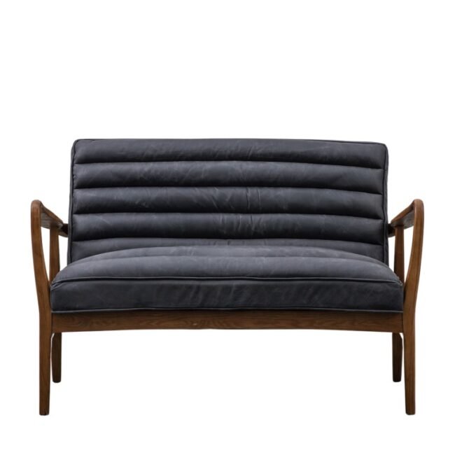 Datsuk 2 Seater Sofa: Stylish mid-century 2 seater sofa in top grade leather depicting natural textures and grains, decorative horizontal channel stitched detailing and a solid oak angled frame.