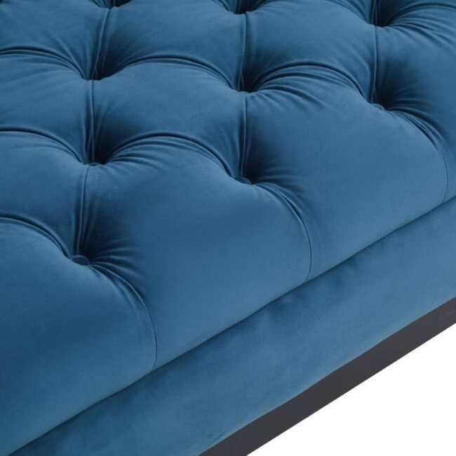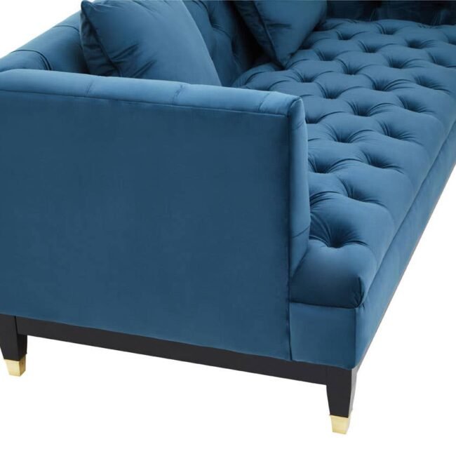 This Dilli Two Seat Navy Fabric Sofa is upholstered in navy fabric with highly resilient seat cushions and deep button tufting. The plush seat is supported with wooden legs, covered with pointed gold finish caps.