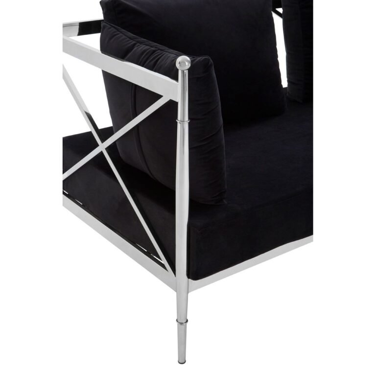 Eaia 2 Seat Sofa With Silver Lattice Arms: Created from strong steel, the frame of the Eaia sofa boasts a cool silver finish, evoking a luxurious feel. The metallic body is counterpointed by the lush black velvet that upholsters the seat and four cushions, creating a soft textured finish. The Eaia sofa is a distinctive design piece with a minimal, angular frame that is equal parts sophisticated and opulent.
