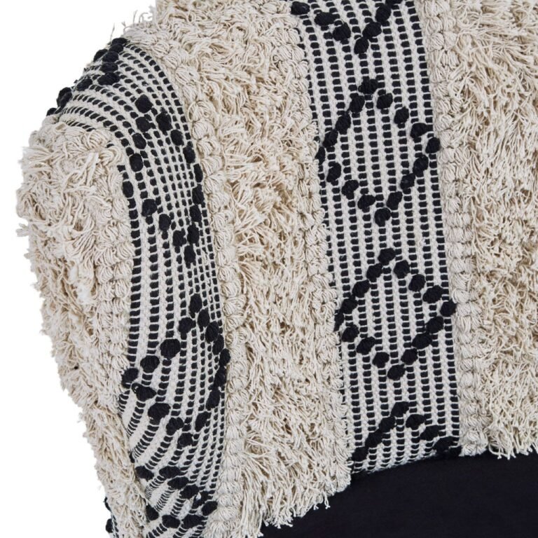 Fena Moroccan Sofa: Inspired by Moroccan design, this sofa has a padded and rectangular-shaped velvet seat. The brimming backrest has a vertical geometrical black and white pattern. Elegantly carved mango wood and sled legs are coloured in black to complement the monochrome style.