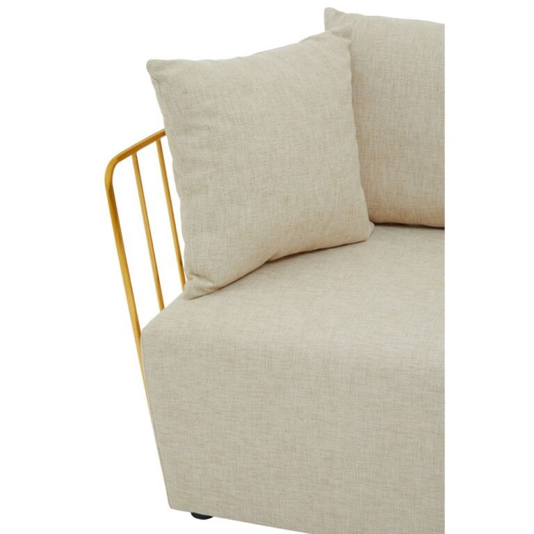 This sofa lends an art deco allure to the area with the combination of natural fabric and gold effect metal frame. A series of stainless steel bars create an angular profile, and the foam-padded seat with four pillows offers a cosy seating experience.