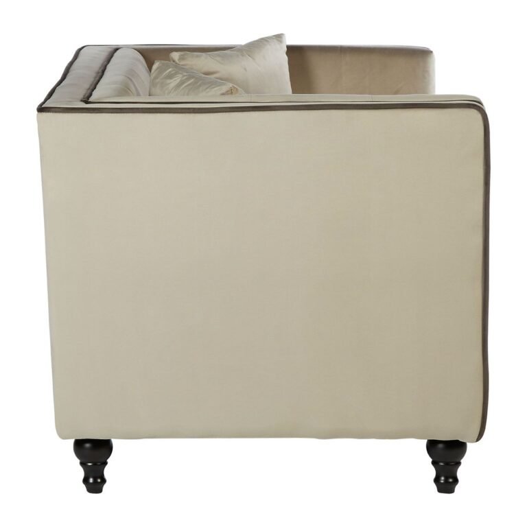 Iris Mink Velvet 2 Seat Sofa: Boasting a distinctive tapered design, the two seat Ferris sofa has a slimmer bottom and wider top with straight, angular edges. The sofa is upholstered in soft mink velvet fabric, with complementary brown piped trim. Shallow button tuft detailing adds a traditional element to this contemporary sofa. Decorative feet are carved from sustainable eucalyptus wood, and feature a matte black finish. Two matching mink cushions enhance comfort.
