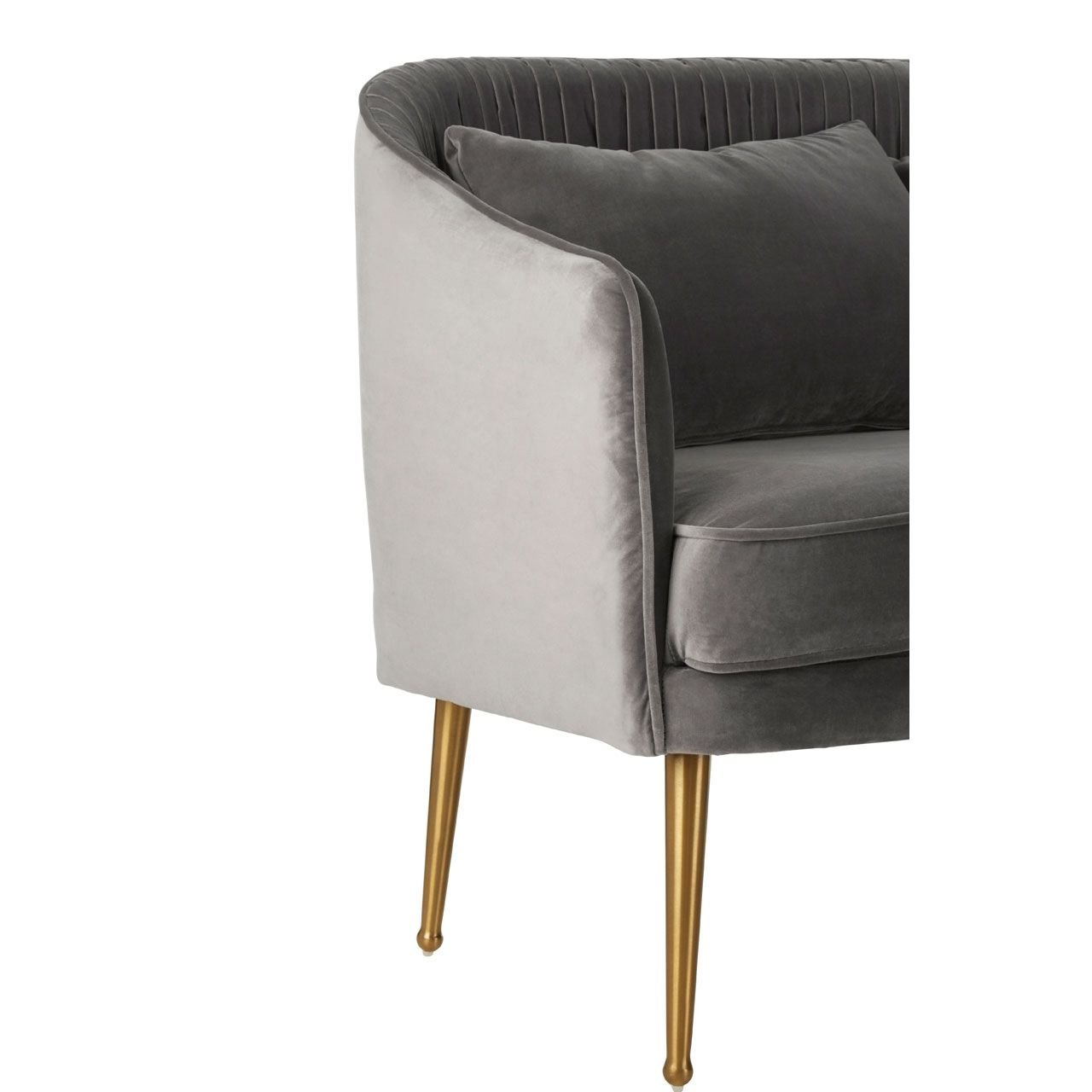 Langley Grey Velvet Sofa: A chic and sophisticated statement piece, the Langley sofa’s back boasts a unique cut-out design. The tactile grey velvet upholstery has been pleated on the sofa’s backrest, adding a sense of texture. Gold finish legs are slender and elegant and provide a stark tonal contrast to the muted tone of the soft upholstery. Two cushions perfectly finish this distinctive design piece and enhance its comfort.