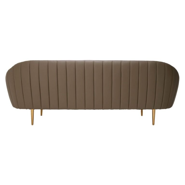 The Mink Elm Lagero Sofa adopts a distinctive silhouette, with a curved backrest that slopes into the armrests and seat. The muted brown faux leather upholstery is channel-tufted in the rear, adding an unexpected decorative flare. Four reflective stainless steel feet raise the sofa from the ground and feature a luxurious gold finish.