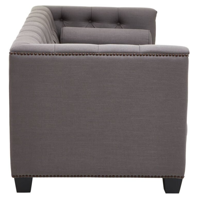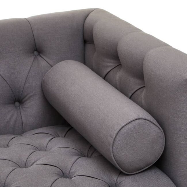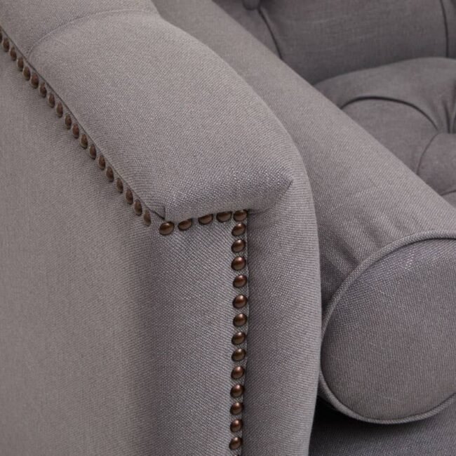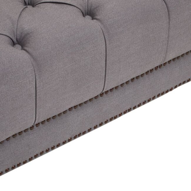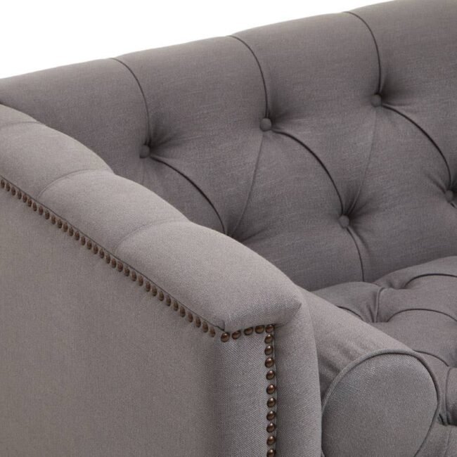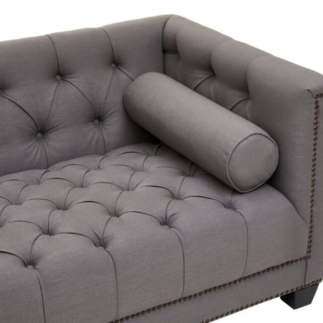 This two seat sofa is upholstered in grey fabric with button tufted detail that keeps it tight and firm. Featuring a low back, parallel arms and rolled cushions, the design is complete with elegantly carved wooden feet.