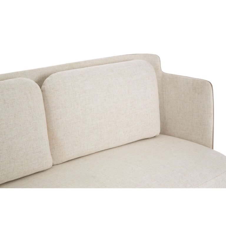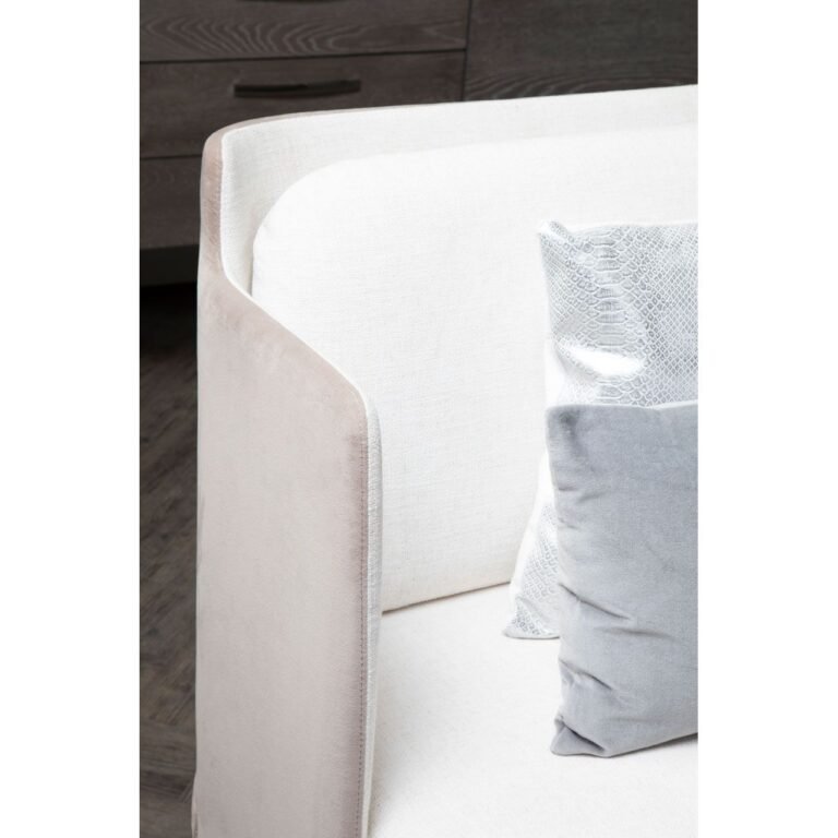 Piet Sofa: Upholstered in white fabric, this two seater sofa features a thick padded seat with matching cushions. It has a simple profile with a curved back in a muted shade which contrasts the soft white hues. Sleek silver finish metal legs give the overall, understated design a metallic edge.