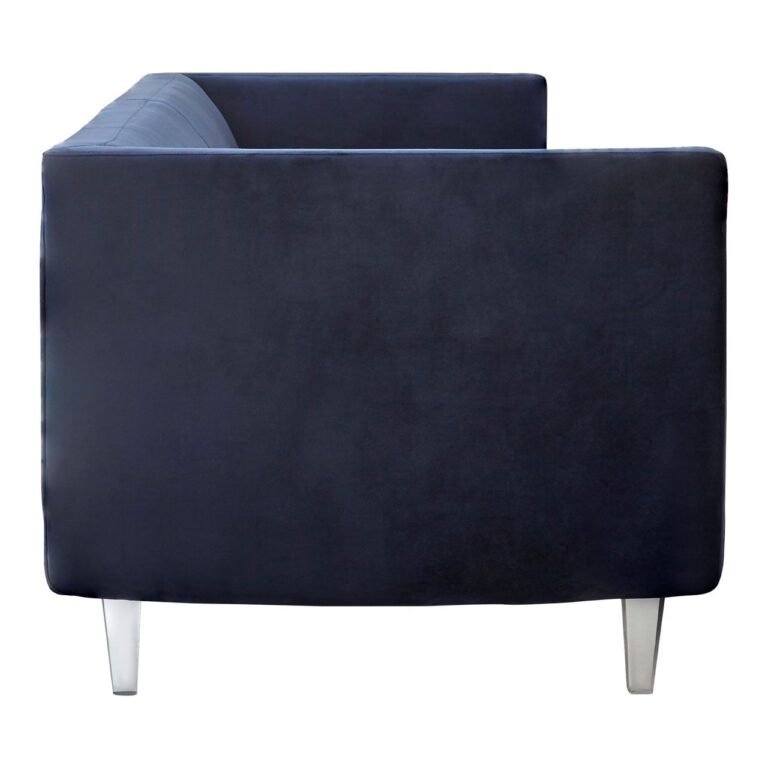 Pinte Dark Blue Sofa: Upholstered in dark blue velvet, this sofa will make a statement with its vibrant colour. Its low armrests and slightly curved backrest are paired with a wide cushioned base to provide a comfortable sitting experience. Clear acrylic tapered legs uplift the sofa’s wooden aesthetic and coordinate with the luxurious and tactile fabric.