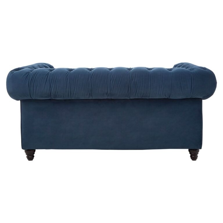 Rachel 2 Seater Midnight Velvet Sofa low seating profile, carved wooden feet, rolled arms, and deep button tufting give the large two seat Stella sofa its timeless Chesterfield look. Two large and plump cushions provide ample seating space, with smooth finishes that accentuate the quilted arms and backrest. A dual line of metal studs embellish the tactile midnight velvet, tracing the sofa’s lines and curves.