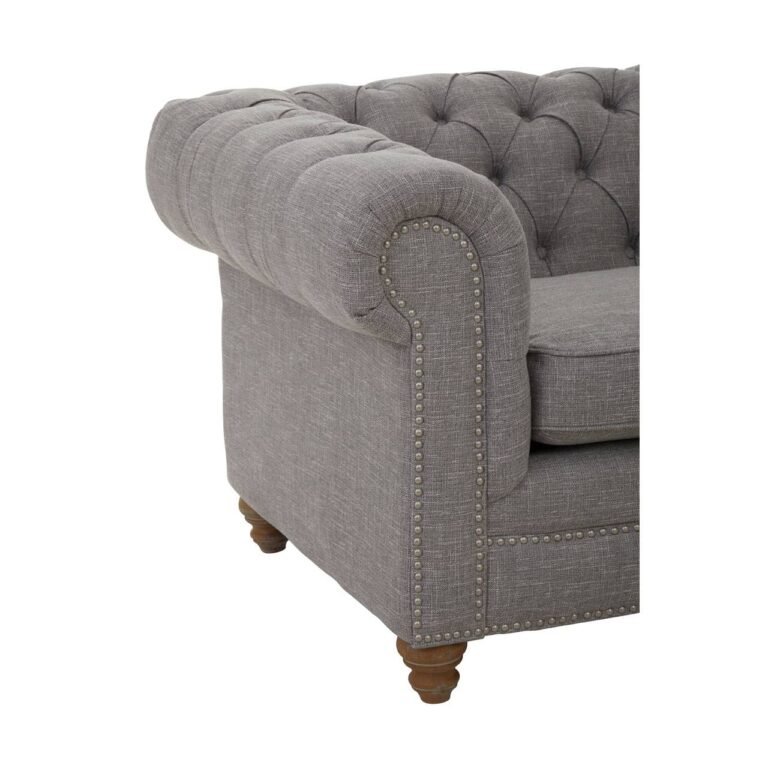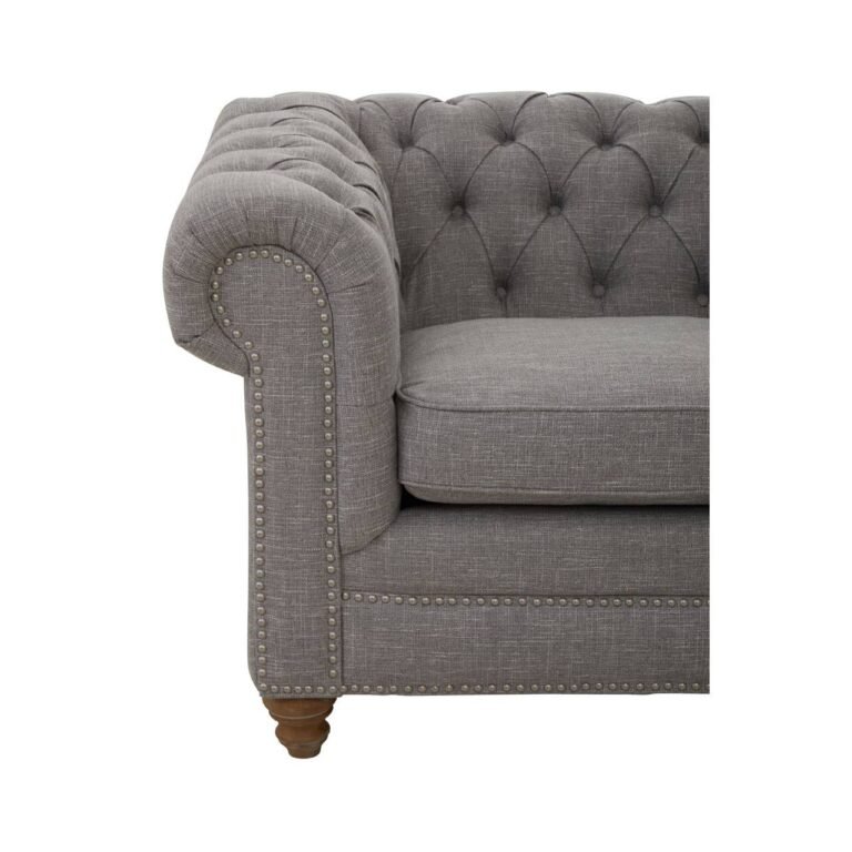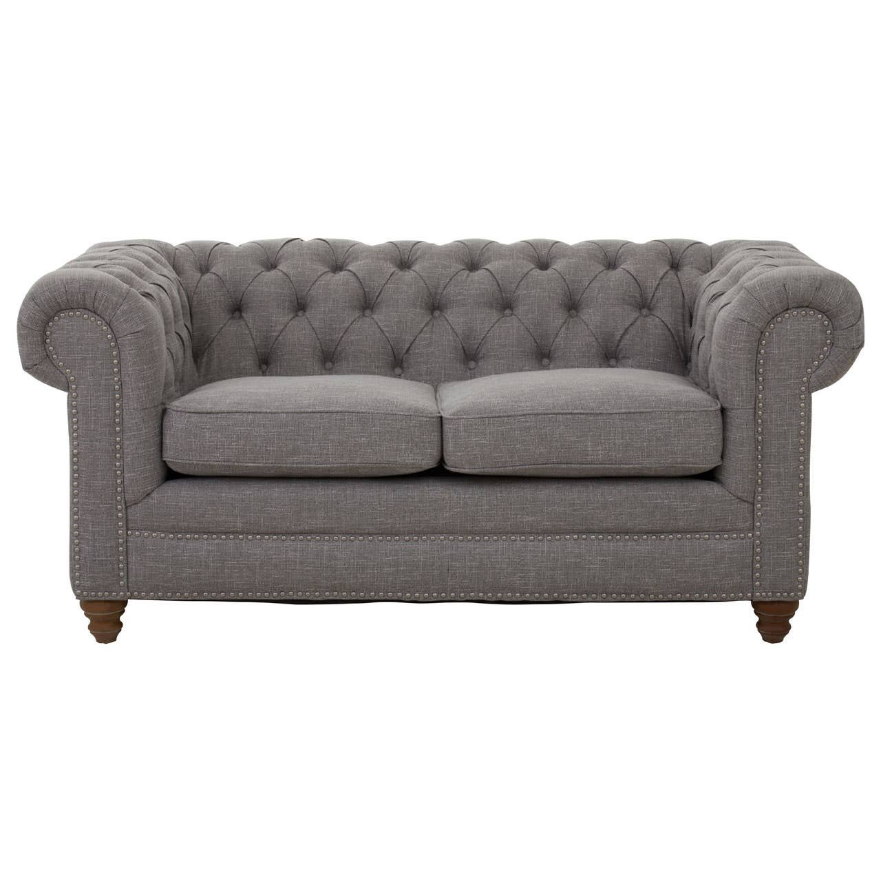 A classic chesterfield design, this two seat sofa with a button tufted back offers luxury with a touch of warmth. Timeless and elegant, the gently scrolled arms complement the smooth lines. Nail head trims add a finishing touch to the design.