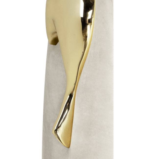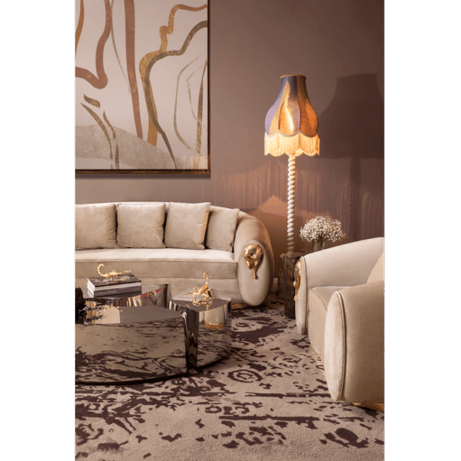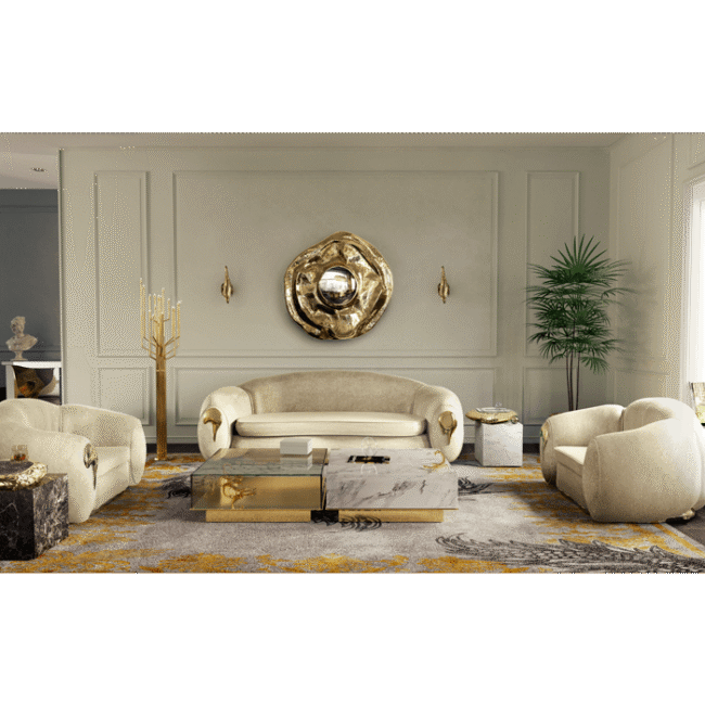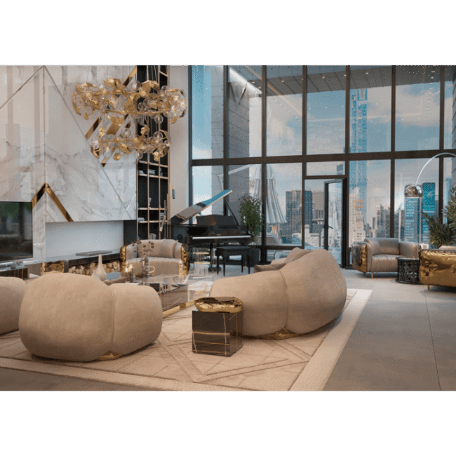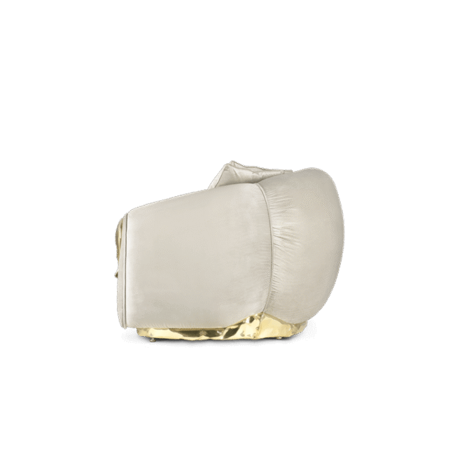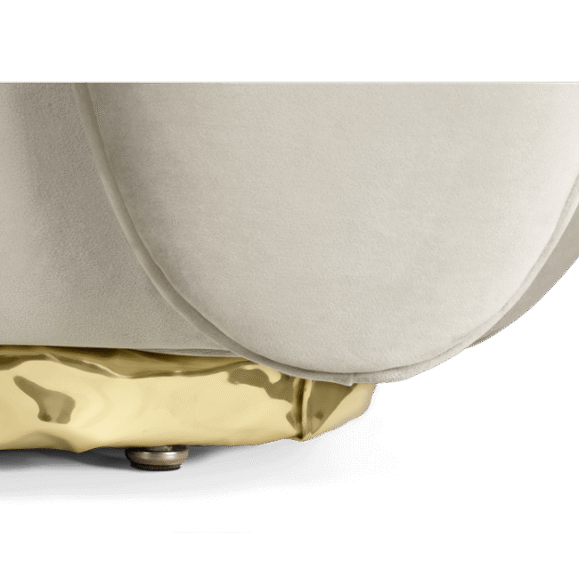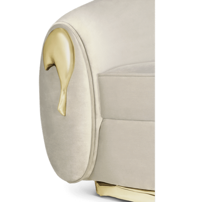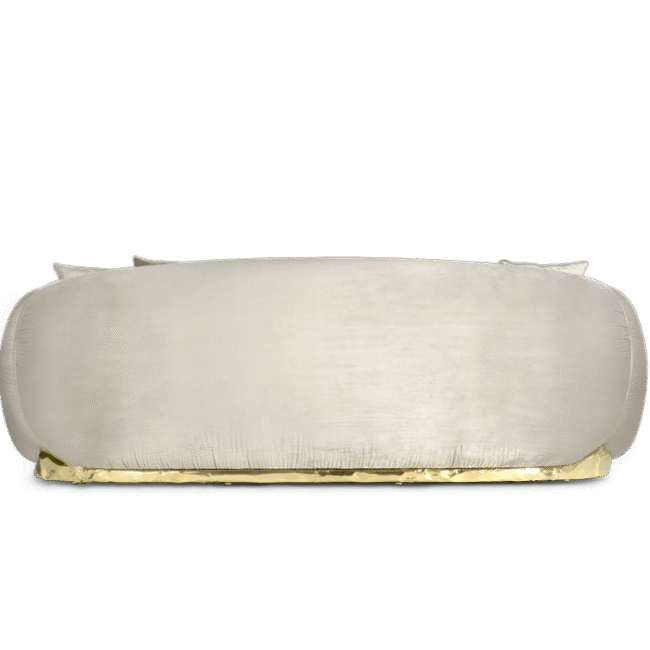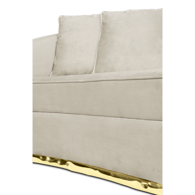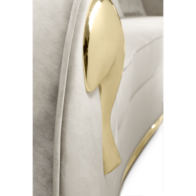 Soleil Sofa is a synthesis of styles and senses. Inspired by the spirit and mission of the famous Cirque de Soleil, the purpose is to invoke, provoke and evoke. Soft, sultry curves gently embrace the sitter in this elegant vintage and contemporary style sofa. Except for the supreme levels of comfort, the brass details on the modern sofa perfectly complement the elegant lines of a timeless piece.