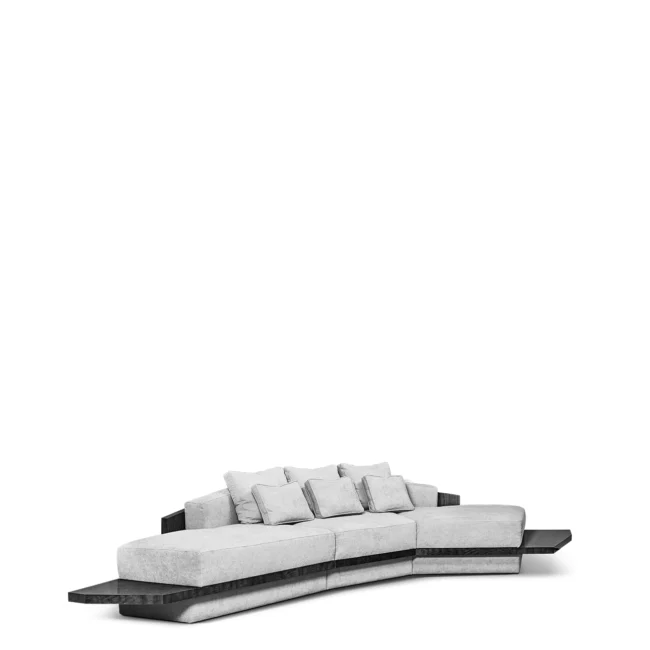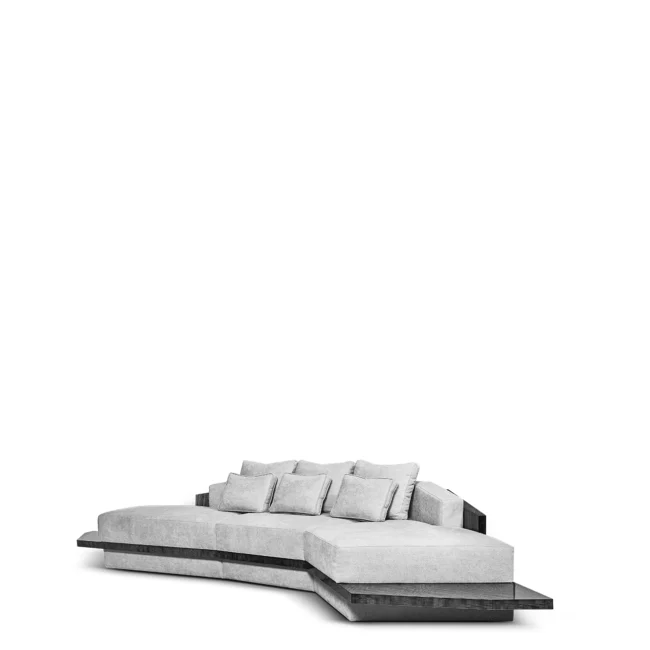 With premium materials such as glossy Eucalyptus Frisé Veneer, polished brass, and grey velvet, the Algerone Angular Sofa gives a modern allure to any living room design with its peculiar organic shape. The concept of comfort acquires a new dimension with a luxury aesthetic epitomized in this upholstery solution.