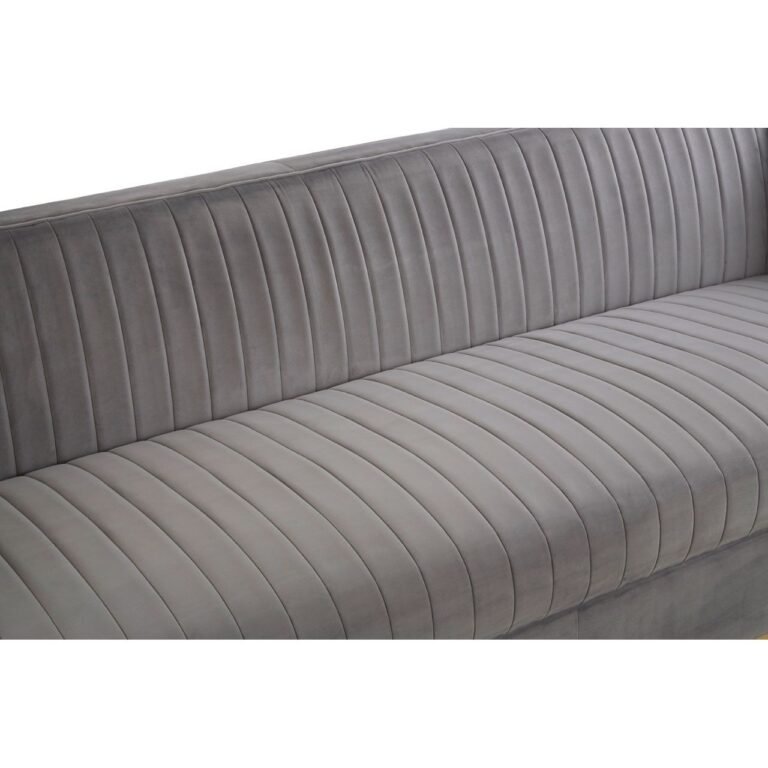This Alpal 3 Seat Grey Sofa will be a sophisticated addition to a contemporary home with its clean lined design in soft grey velvet upholstery. Channel tufting lends a touch of tactile texture to the padded seat and backrest. The warm metallic base contributes to the glam appeal of this statement piece.