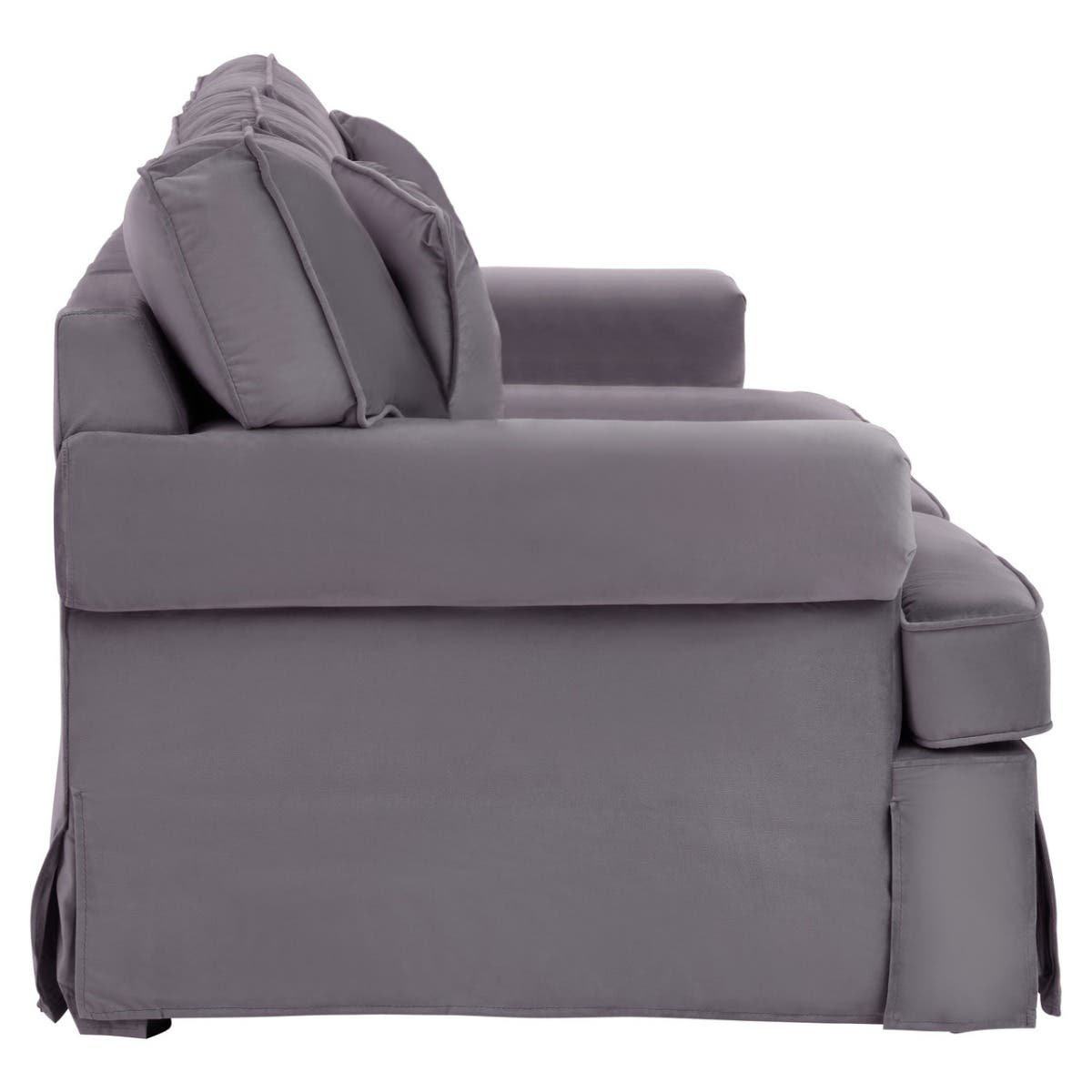 The Alph three seat grey velvet sofa has a slipcovered front that adds a finishing touch to the classic style.