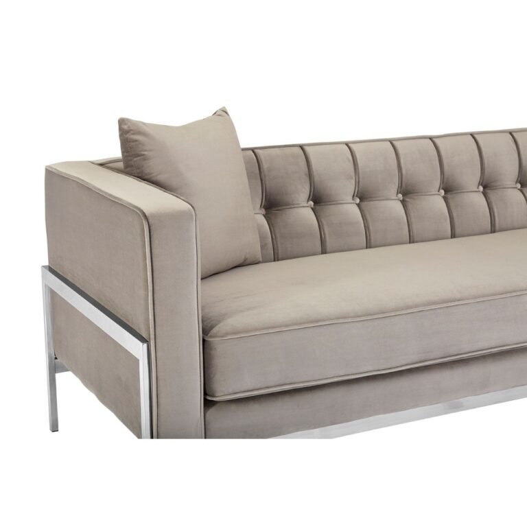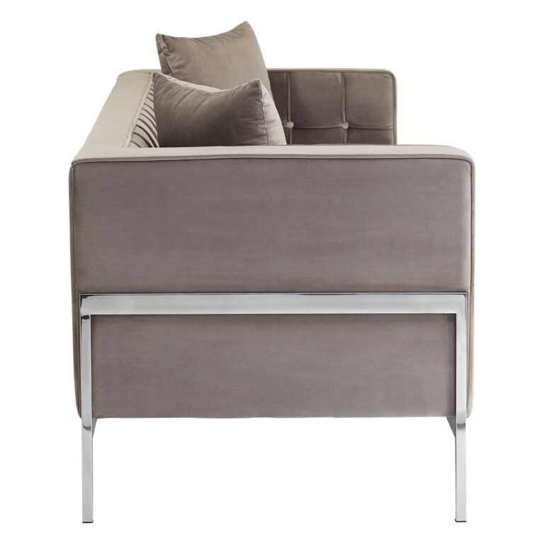 The low profile backrest and arms of this Berto Grey Velvet 3 Seat Sofa have a shallow button tufted design. Its box shape and the metallic sheen from the grey velvet give it a contemporary look. A single cushion provides a plump and plush seating area, enhanced by the matching pair of scatter cushions. The sofa is cradled by a minimal metal frame with a polished finish that complements the grey.