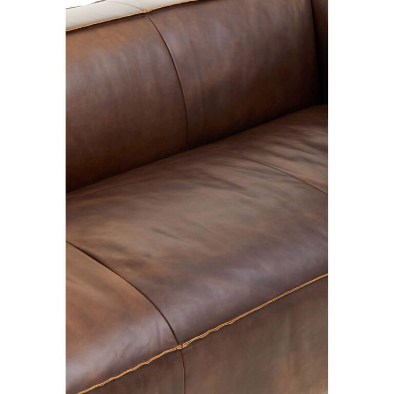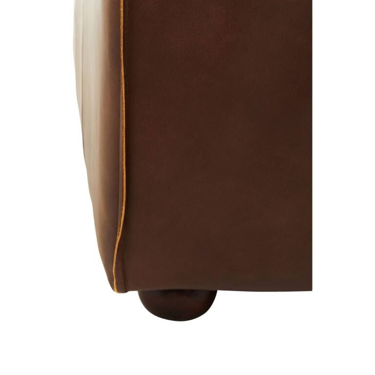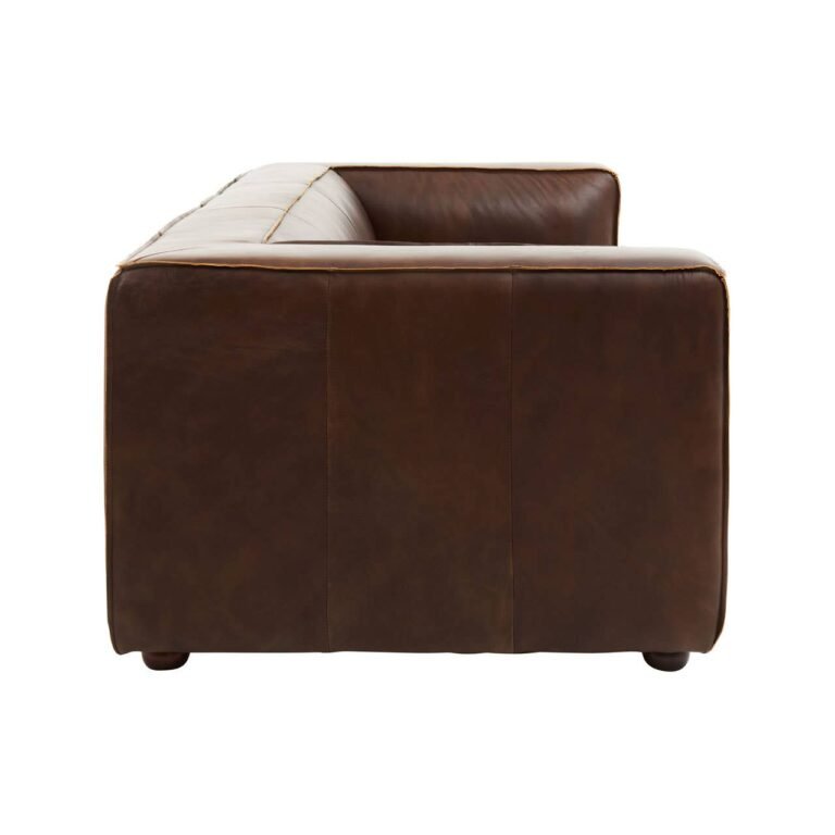 This three seat sofa in genuine dark brown leather upholstery features a clean low back with parallel armrests. Clean lines and trim wrap the padding and contribute to modern minimalism. Eco-friendly rubberwood orb legs match the tactile leather and enhance classic sophistication.