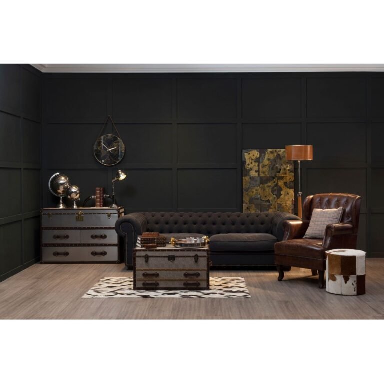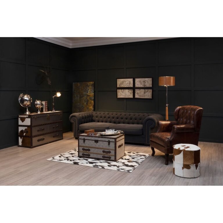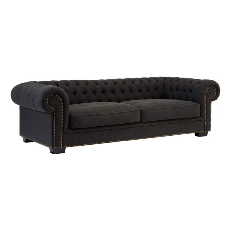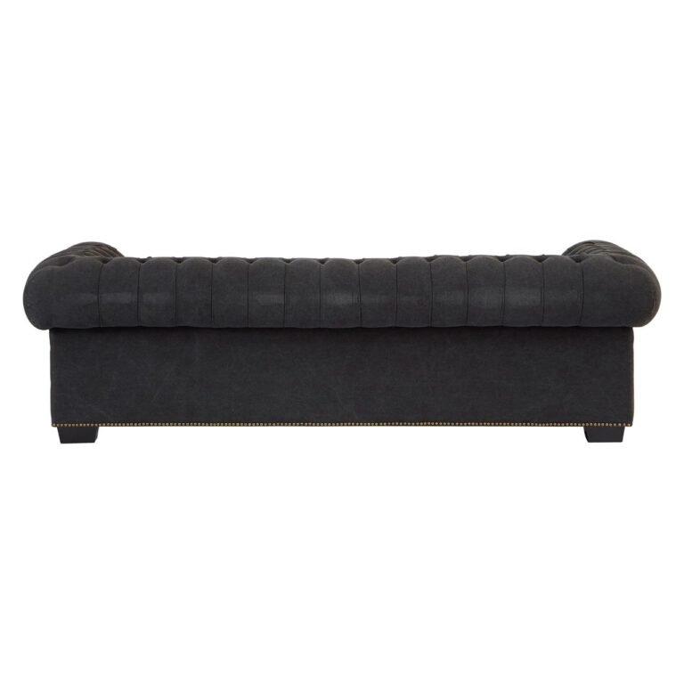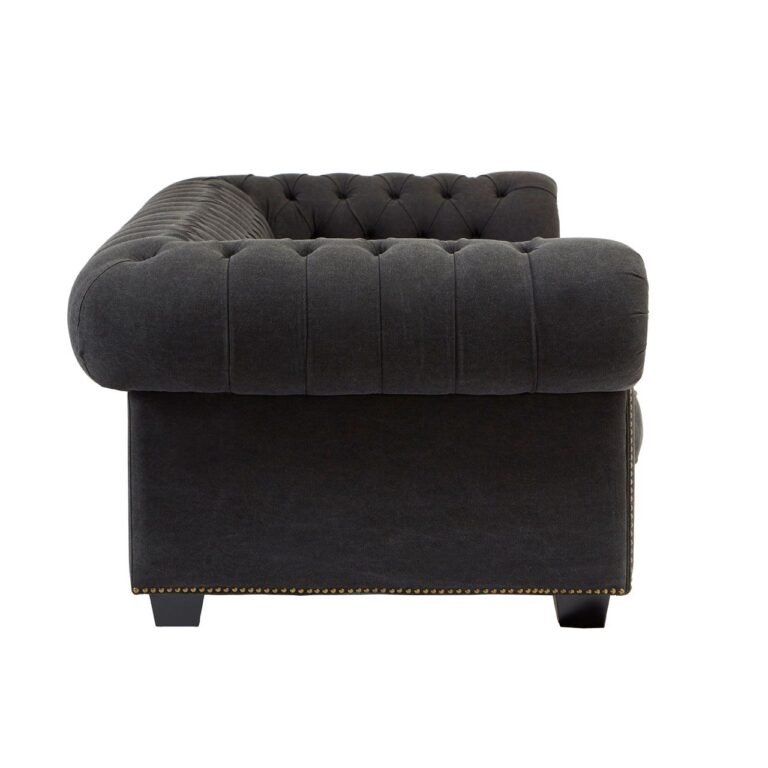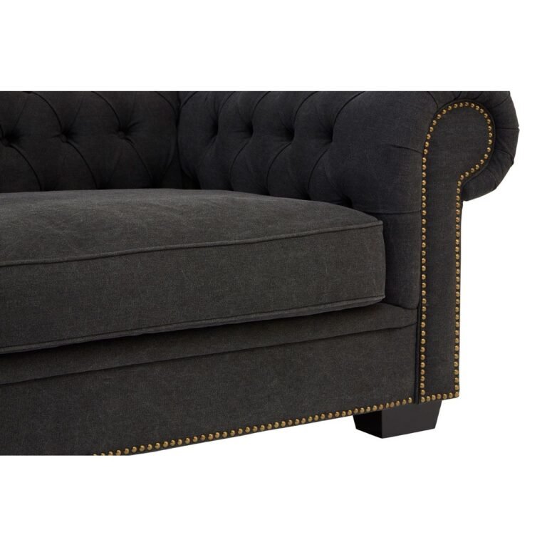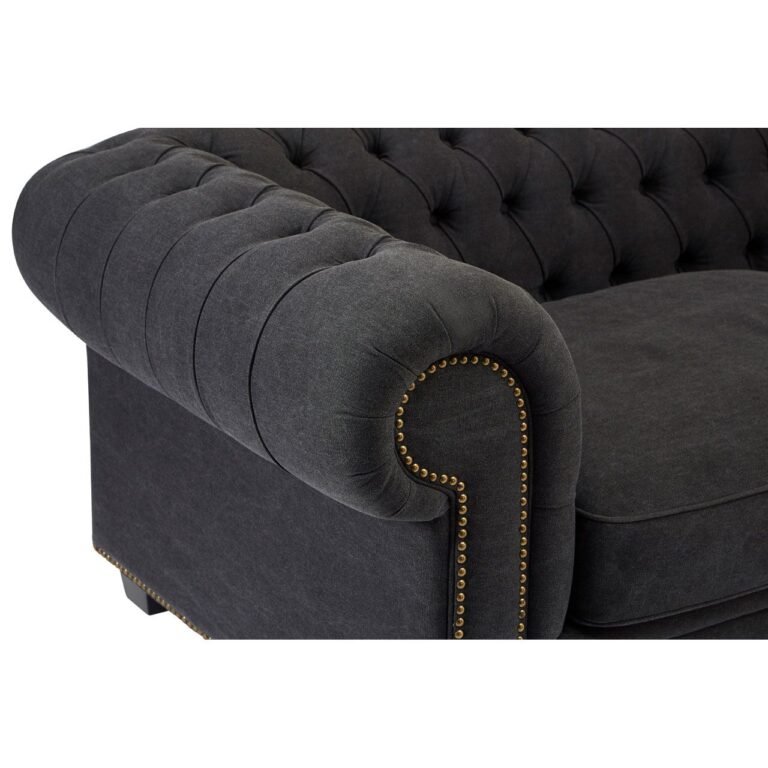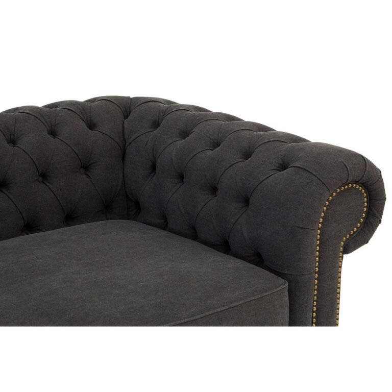 The Fairfax sofa is a substantial statement piece. Comfortably seating three people, it boasts deep cushions and a firm, supportive backrest. Its dark grey textured fabric upholstery provides a rich canvas for the warm metallic studs that trace a pattern on its rounded armrests and apron. Black coloured natural wood feet complement the charcoal upholstery.