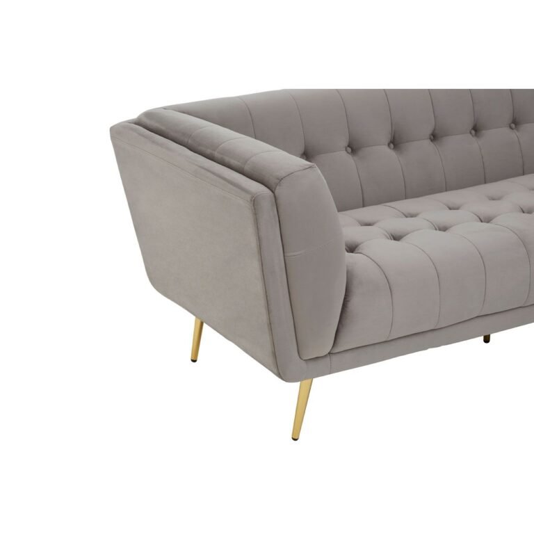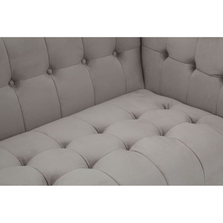 This Gainsborough 3 Seat Grey Velvet Sofa features a timeless design and a box pattern with buttons, showcasing a vintage look. The three-seater, heavily padded, along with angled back arms adds an accent of luxury to the living room.