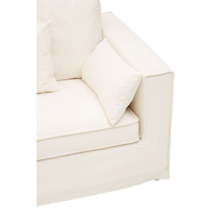 The Leighton 3 Seat Cream Sofa features cream coloured linen upholstery with padded seat and matching cushions. The sofa is adorned with linear detailing on the lower front which adds to its luxe aaesthetic.