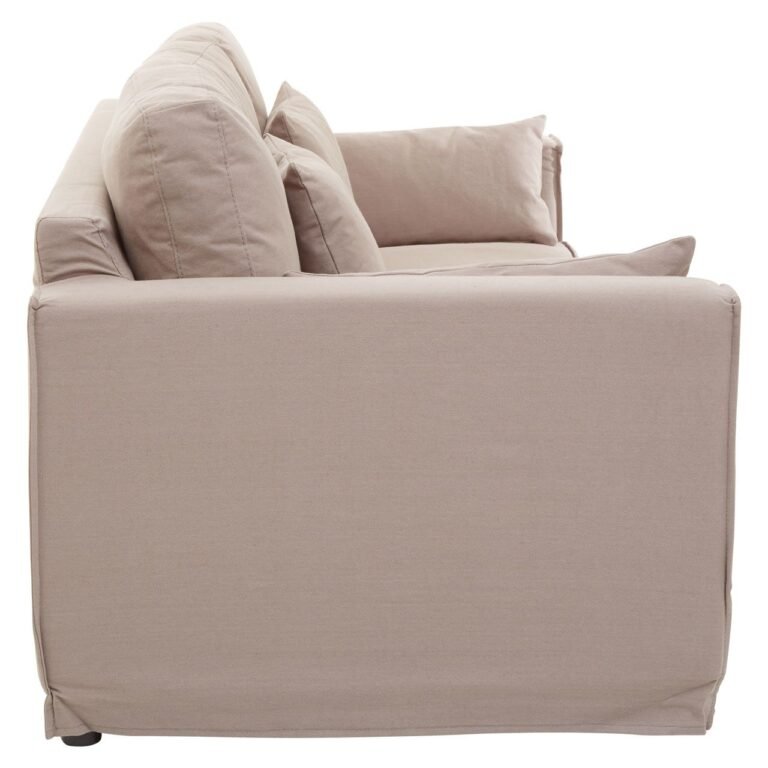The Leighton 3 Seat Sofa features cream coloured linen upholstery with padded seat and matching cushions. The sofa is adorned with linear detailing on the lower front which adds to its luxe aaesthetic.