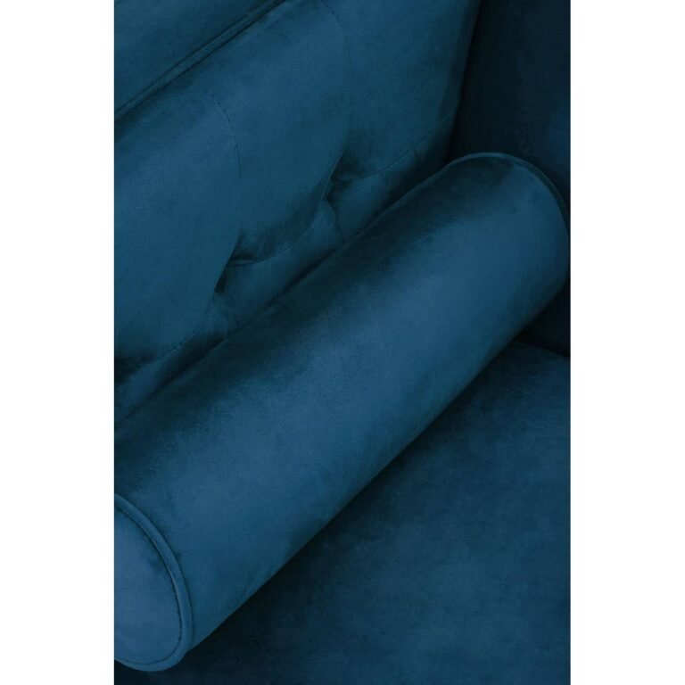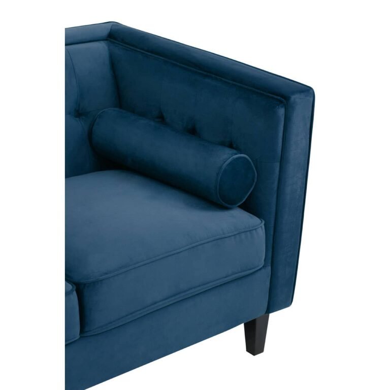 May Blue Velvet Sofa: This densely foam-padded sofa is upholstered skilfully in sumptuous blue velvet upholstery. Boasting a button-tufted detail on the back, the bolster pillows offer comfort, while the slanted oak legs in the black finish add stability to the frame